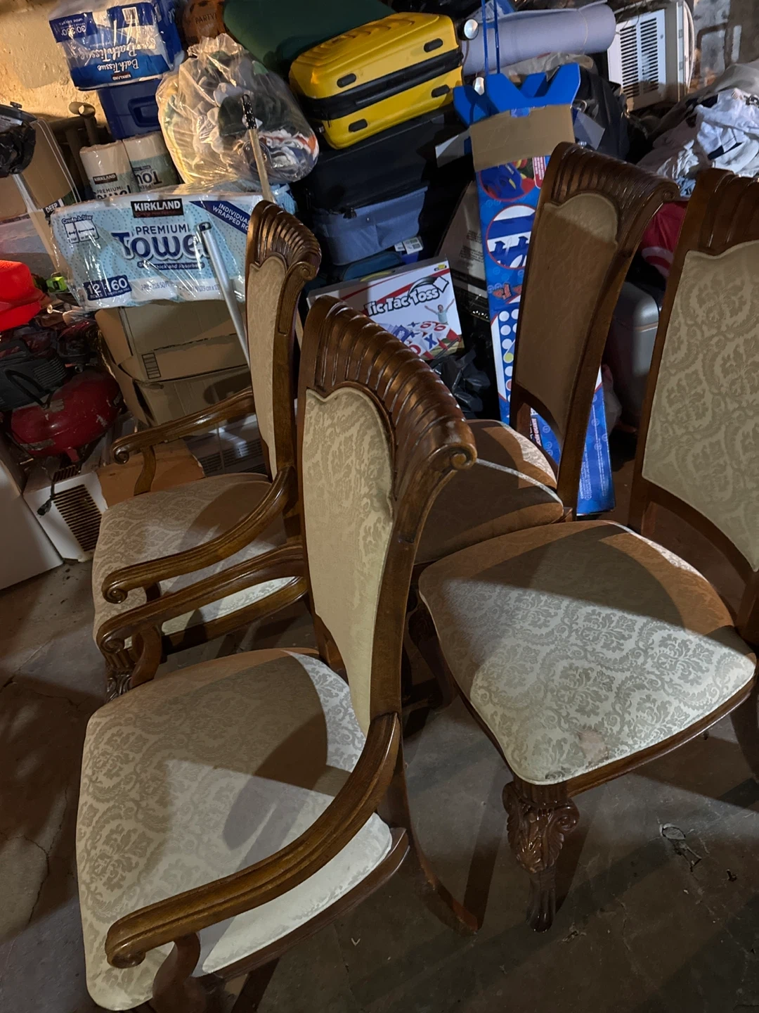Four upholstered dining chairs with ornate wooden frames. The fabric features a damask pattern. These chairs offer a classic look for your dining space. Ready for a new home!