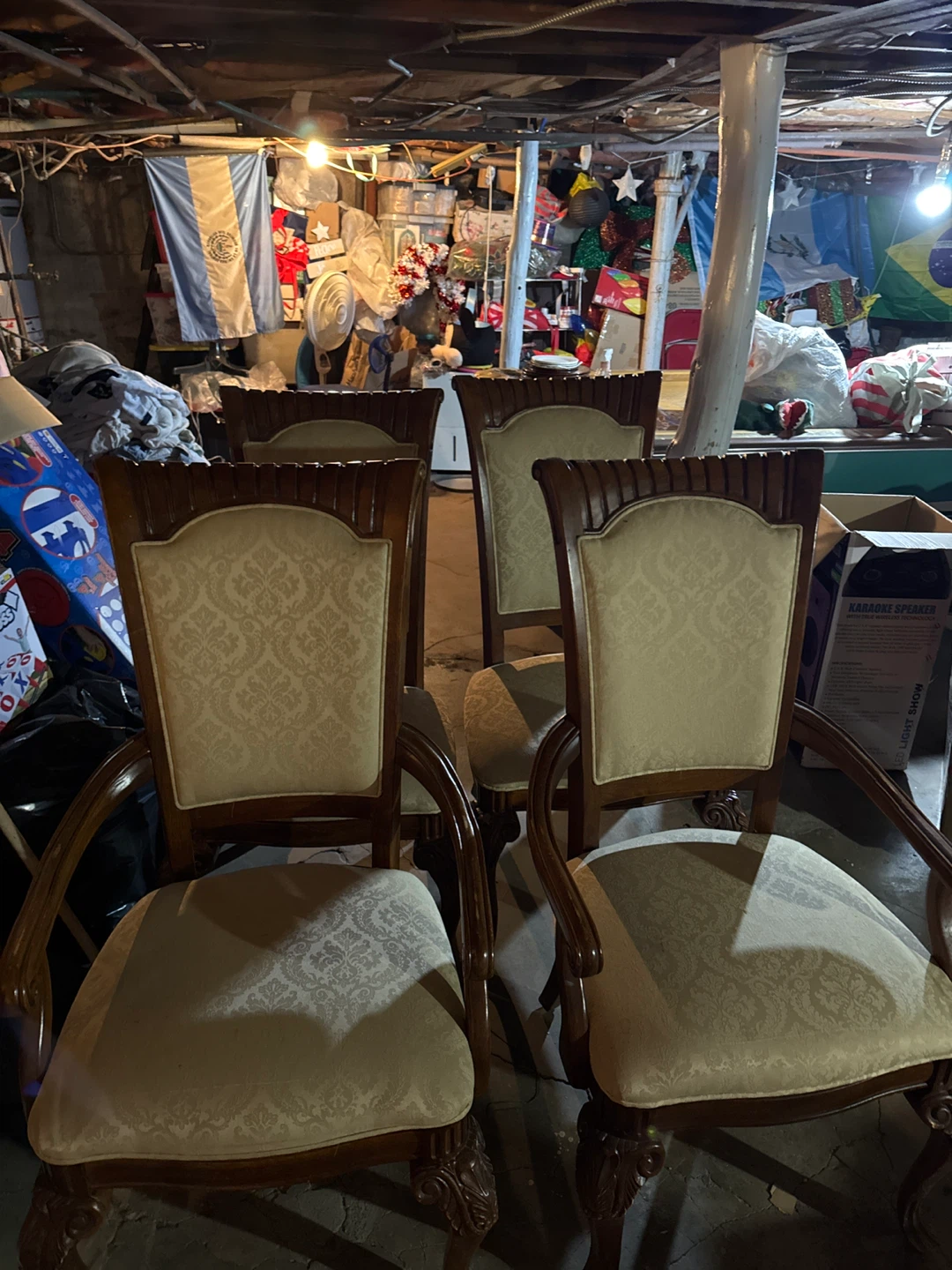 Four upholstered dining chairs with ornate wooden frames. The fabric features a damask pattern. These chairs offer a classic look for your dining space. Ready for a new home!