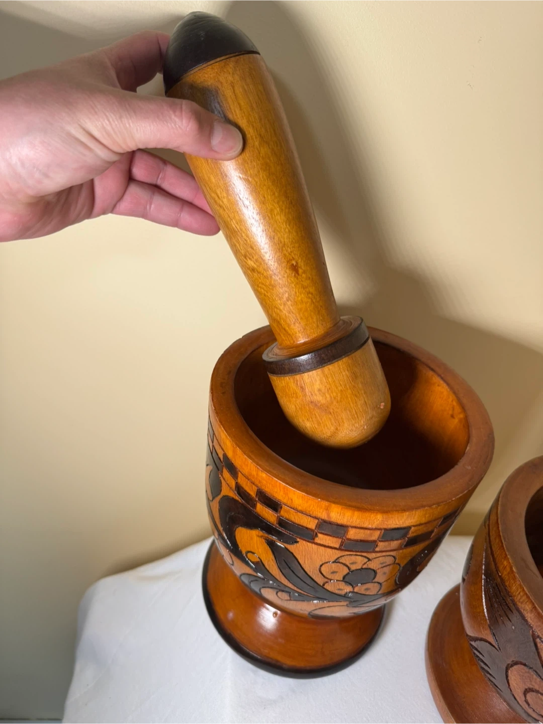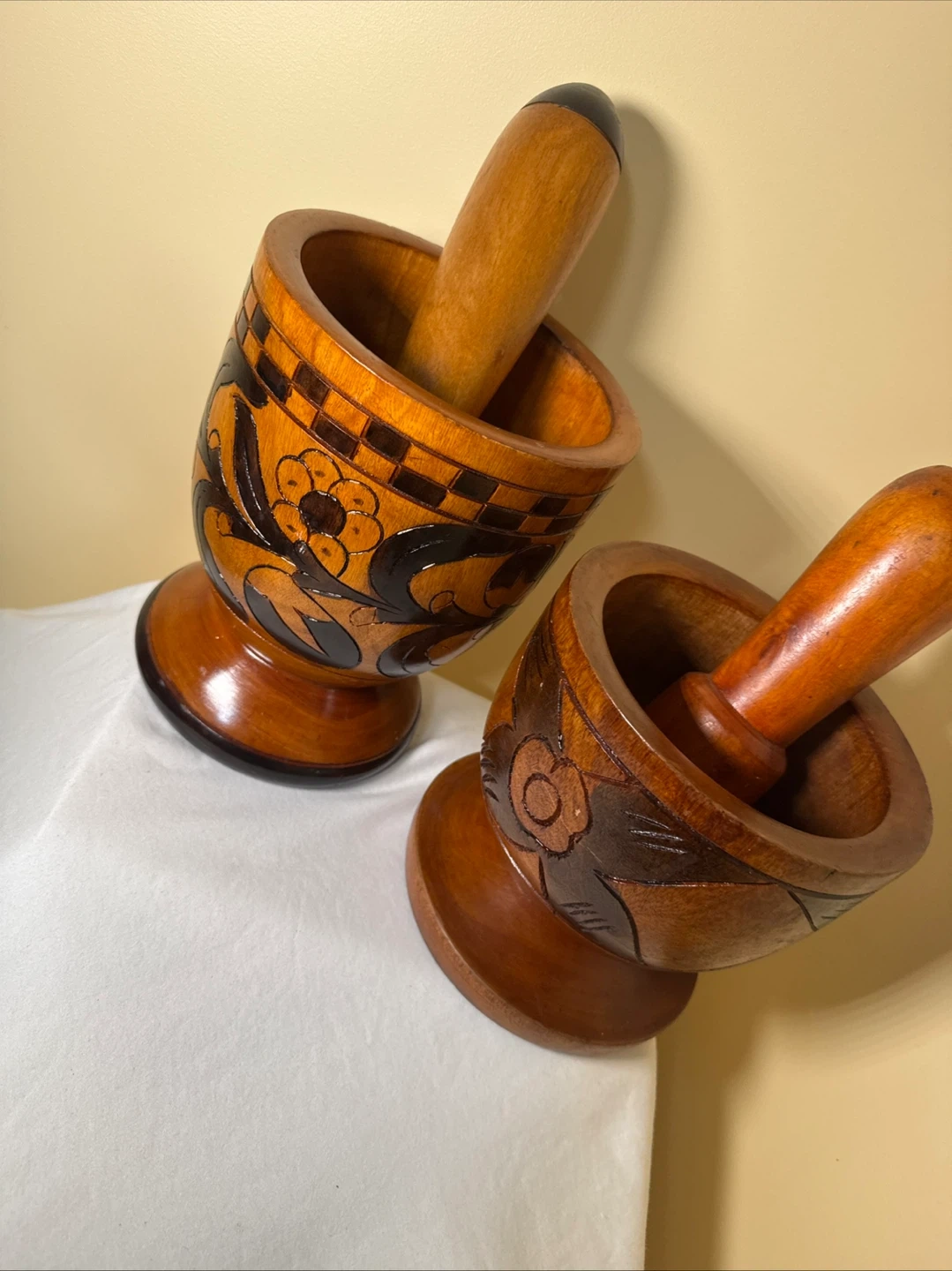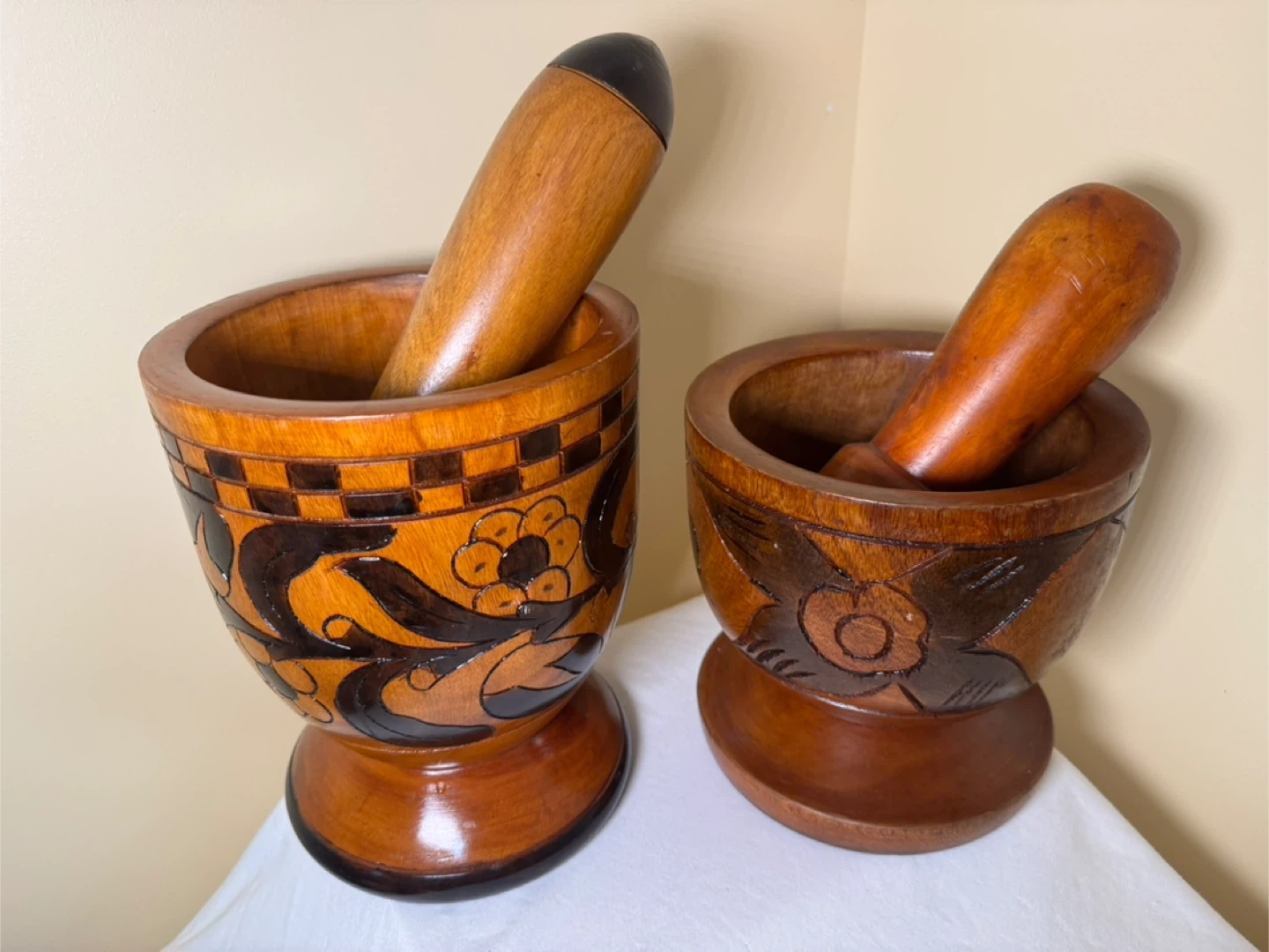 This set includes two wooden mortars and pestles. They feature hand-carved decorative details. Wood material.