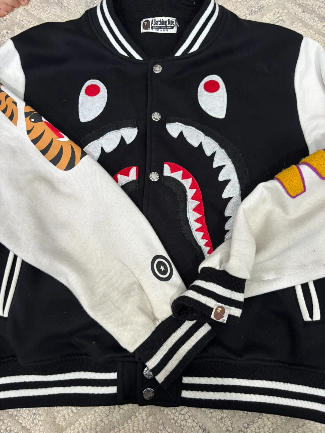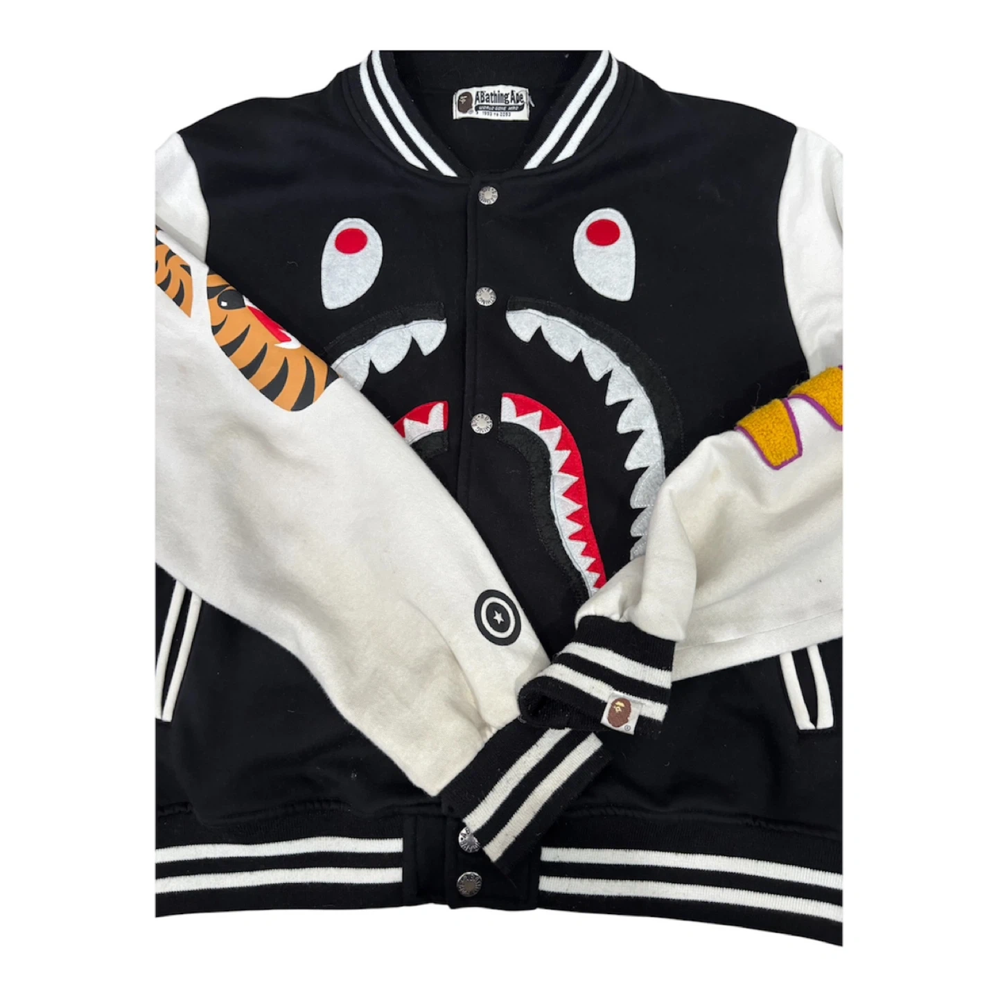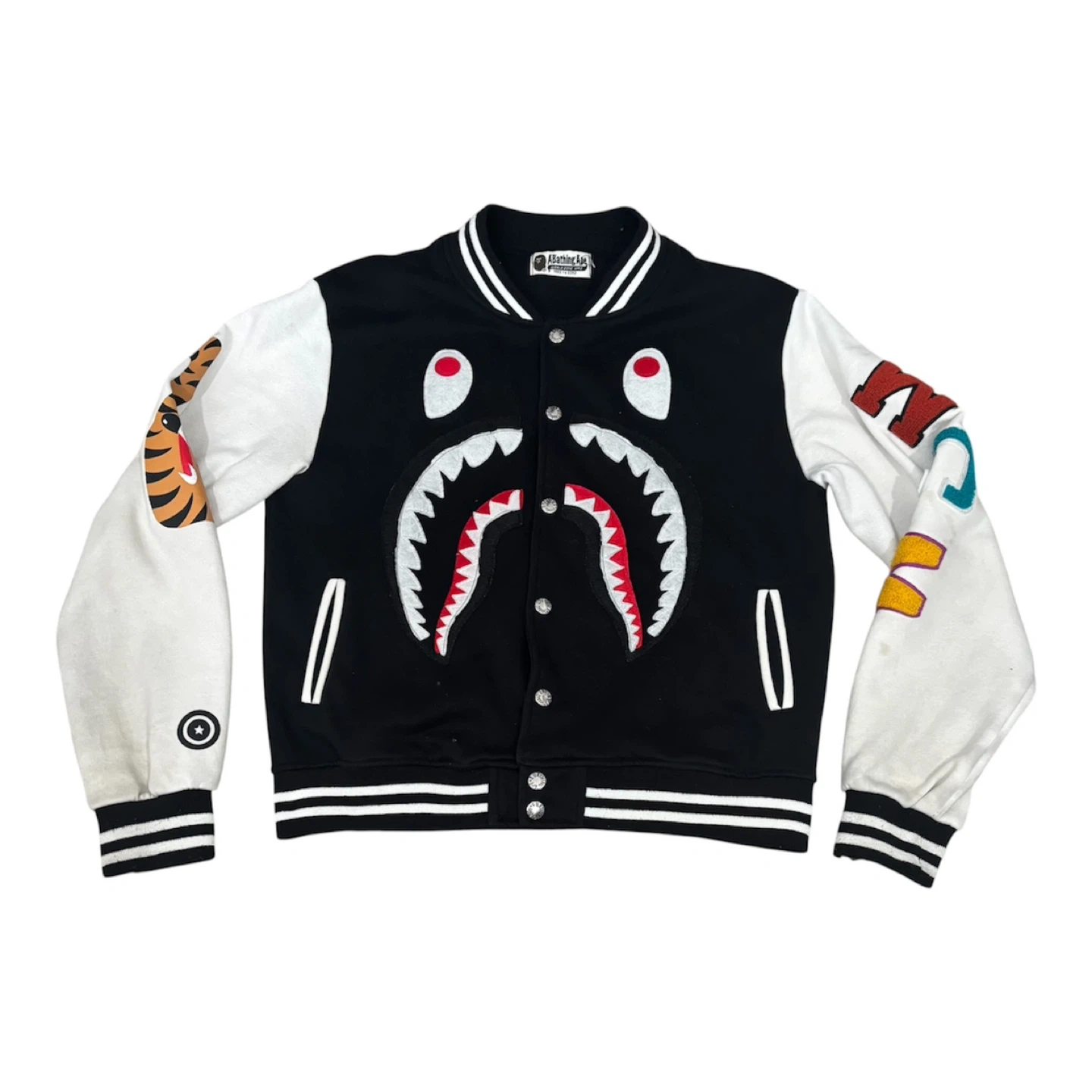 Iconic A Bathing Ape varsity jacket featuring the signature shark graphic on the front. White sleeves have bold graphic designs. Ribbed cuffs, collar, and hem with contrast stripes. Full snap button closure.minor stains on the sleeves.