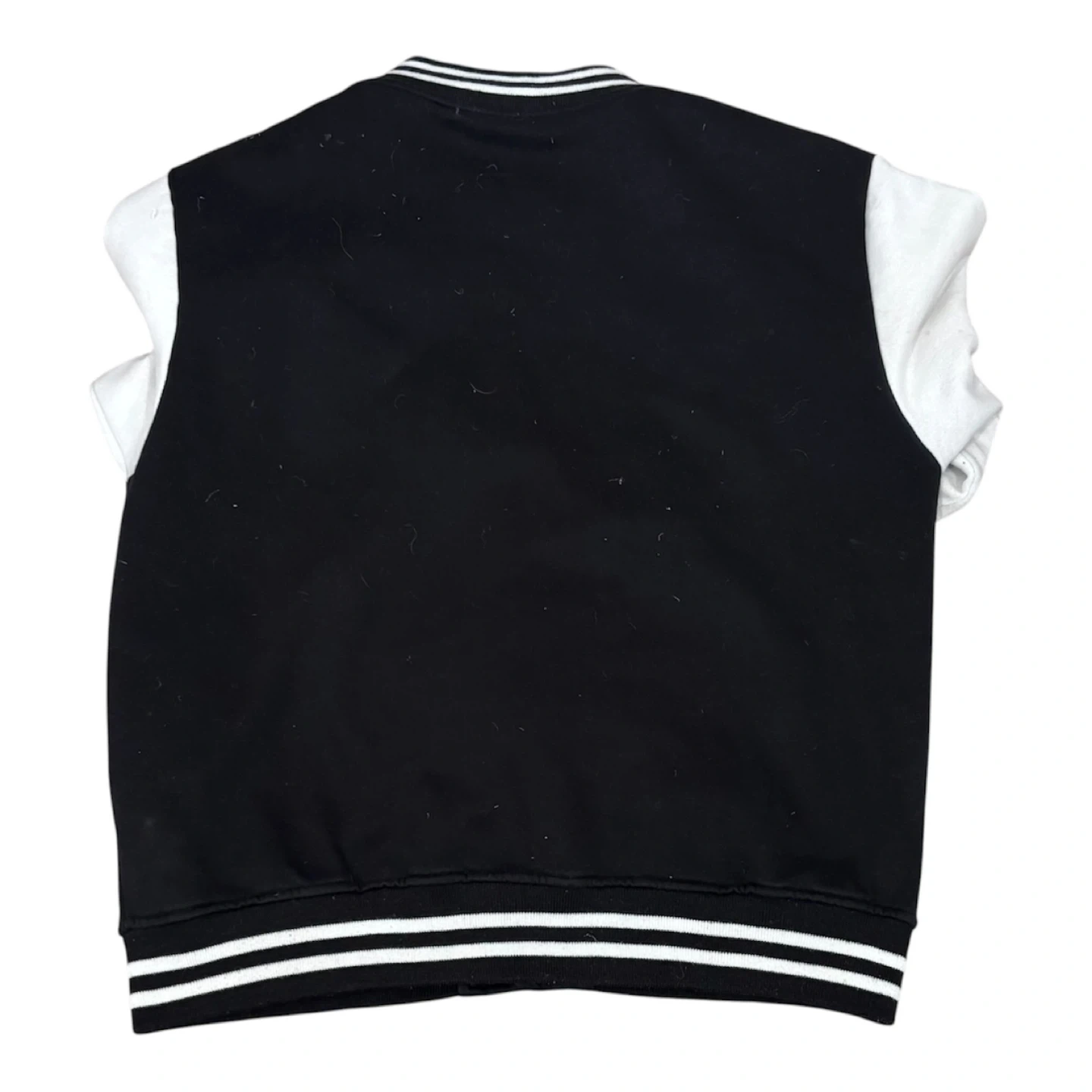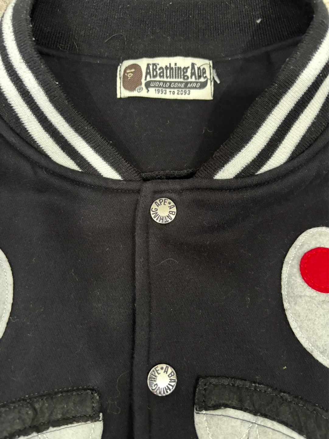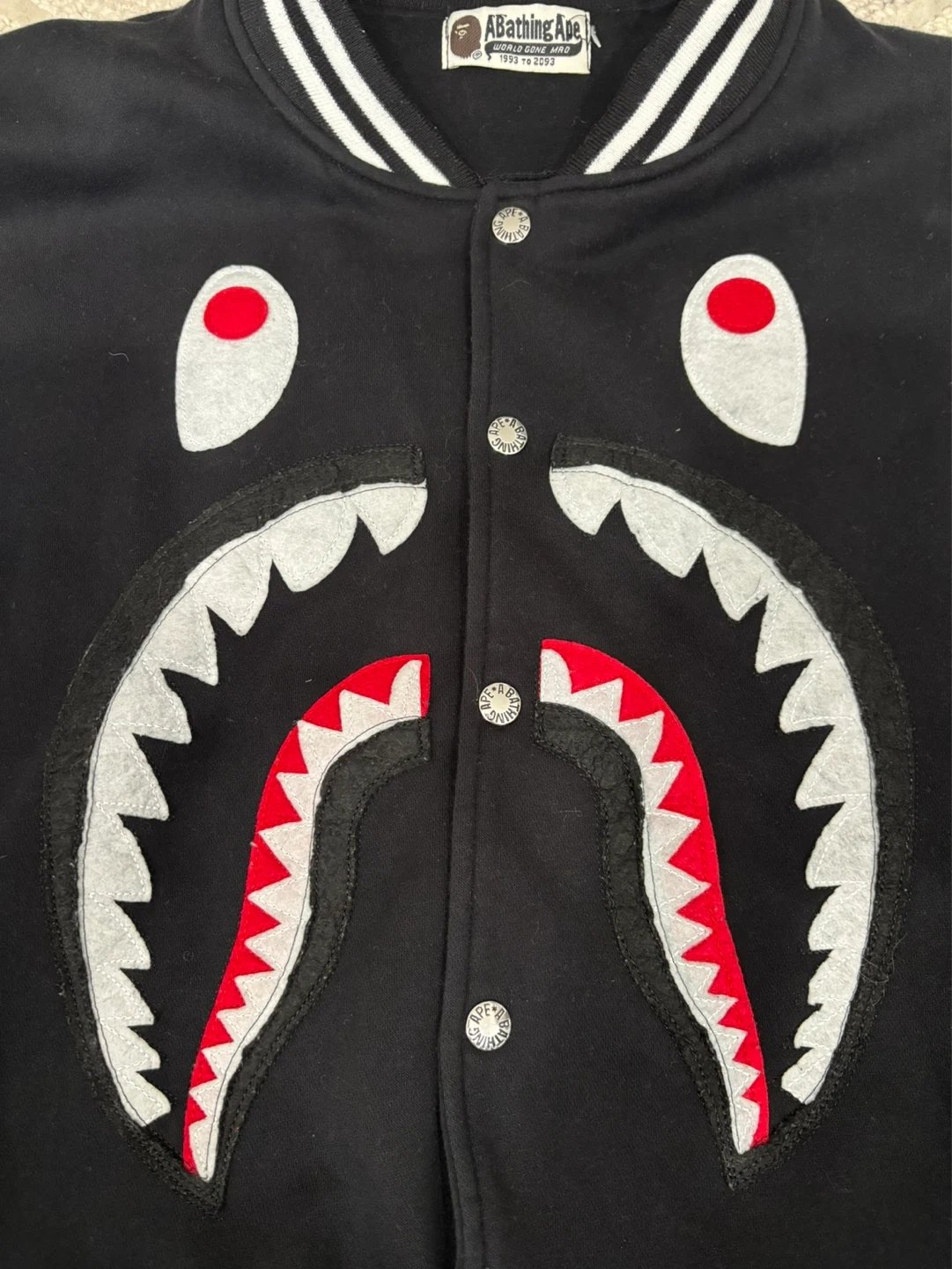 Iconic A Bathing Ape varsity jacket featuring the signature shark graphic on the front. White sleeves have bold graphic designs. Ribbed cuffs, collar, and hem with contrast stripes. Full snap button closure.minor stains on the sleeves.