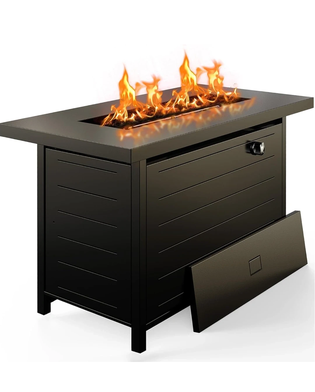 This black outdoor gas fire pit table provides a warm ambiance. It's made of durable material and features a convenient control knob. Its slatted design adds a modern touch to any patio space!