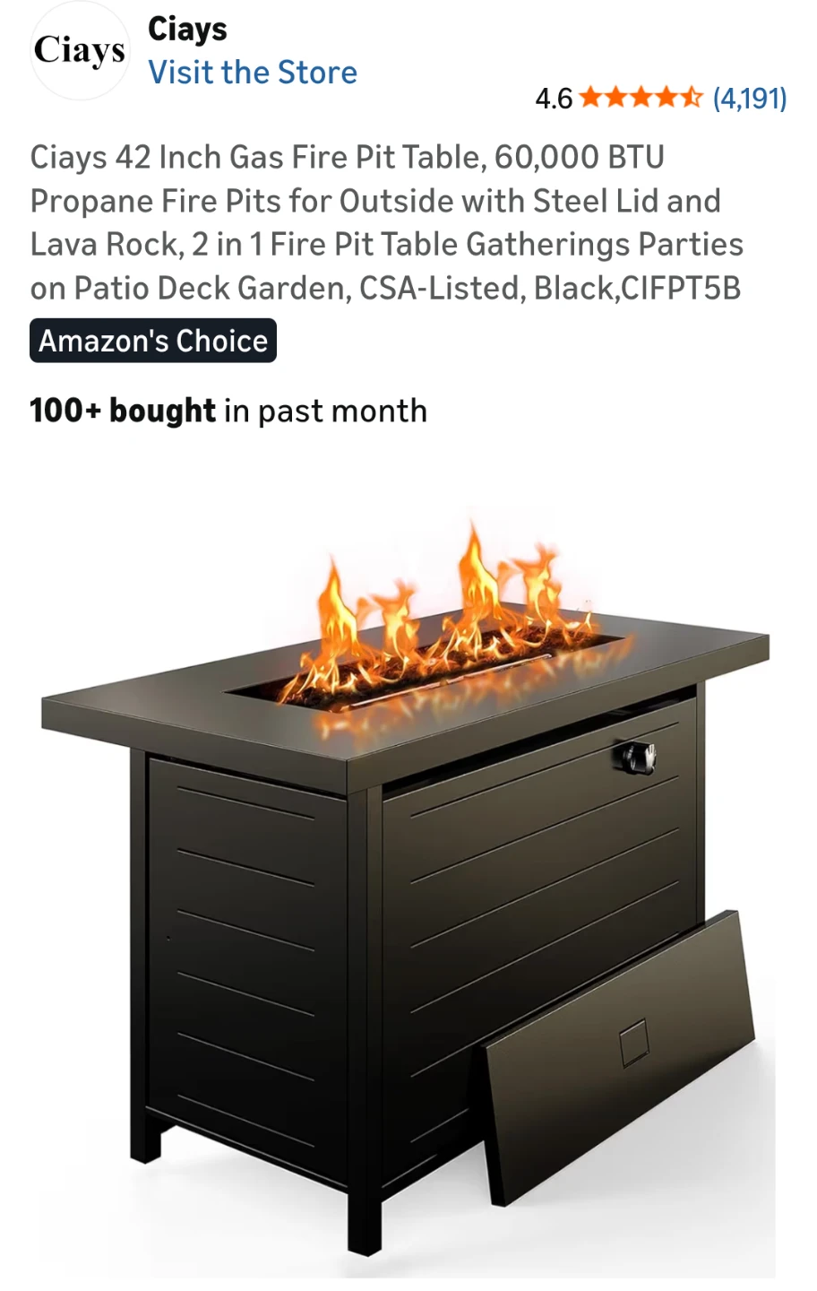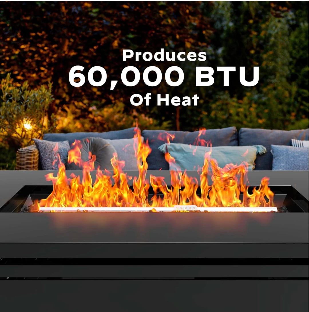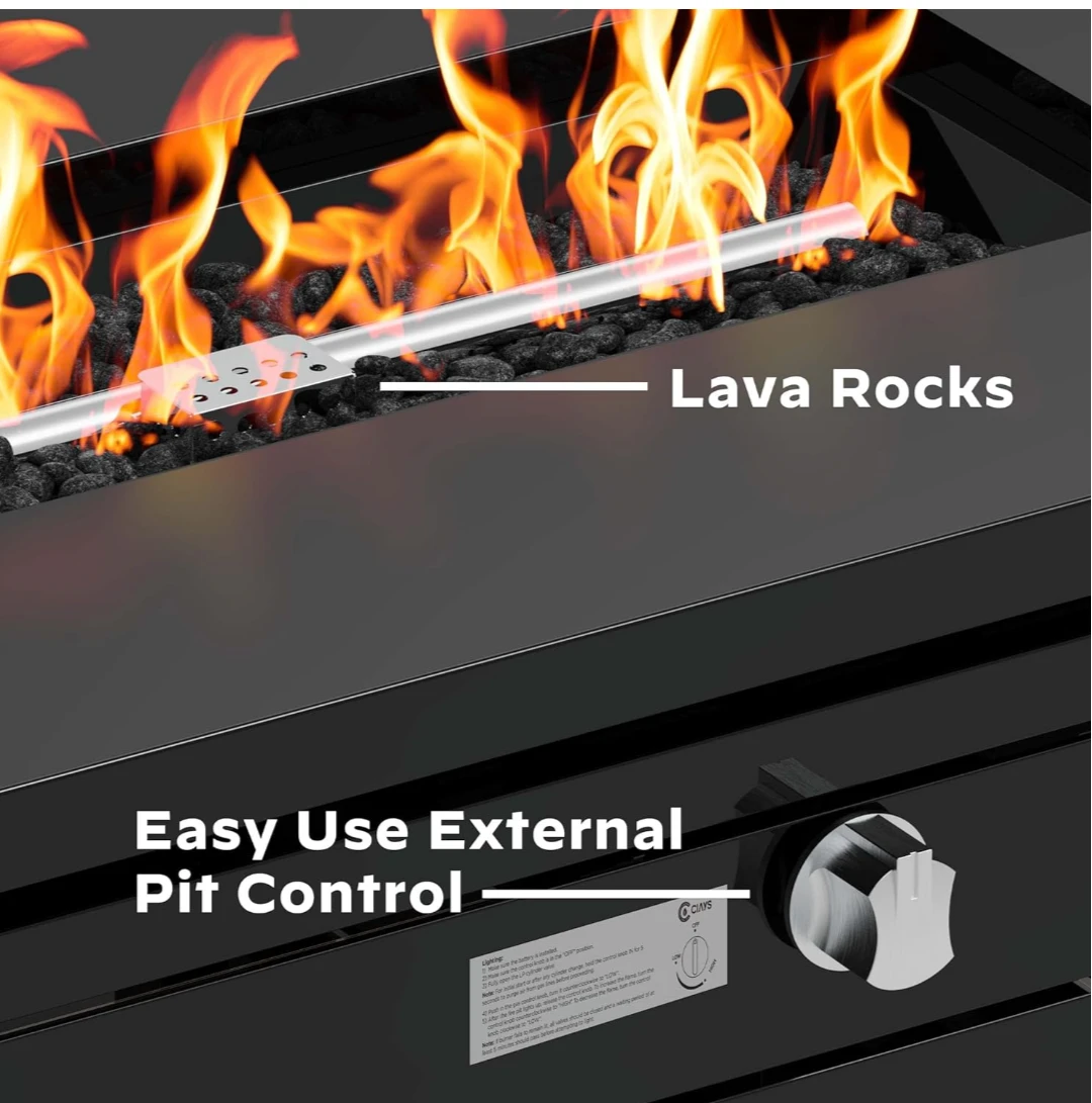 This black outdoor gas fire pit table provides a warm ambiance. It's made of durable material and features a convenient control knob. Its slatted design adds a modern touch to any patio space!