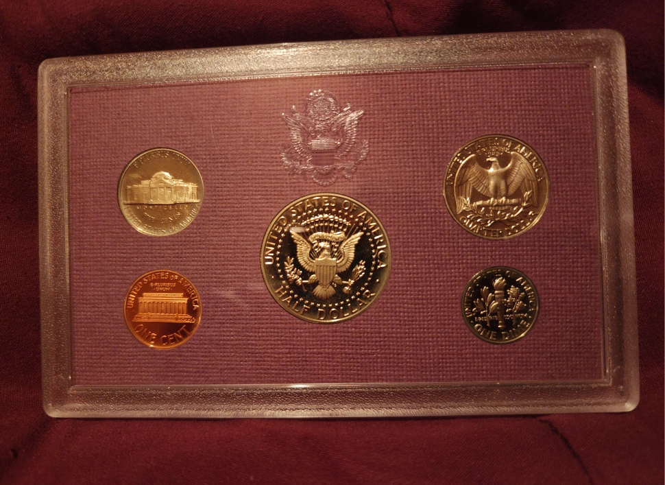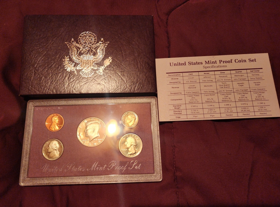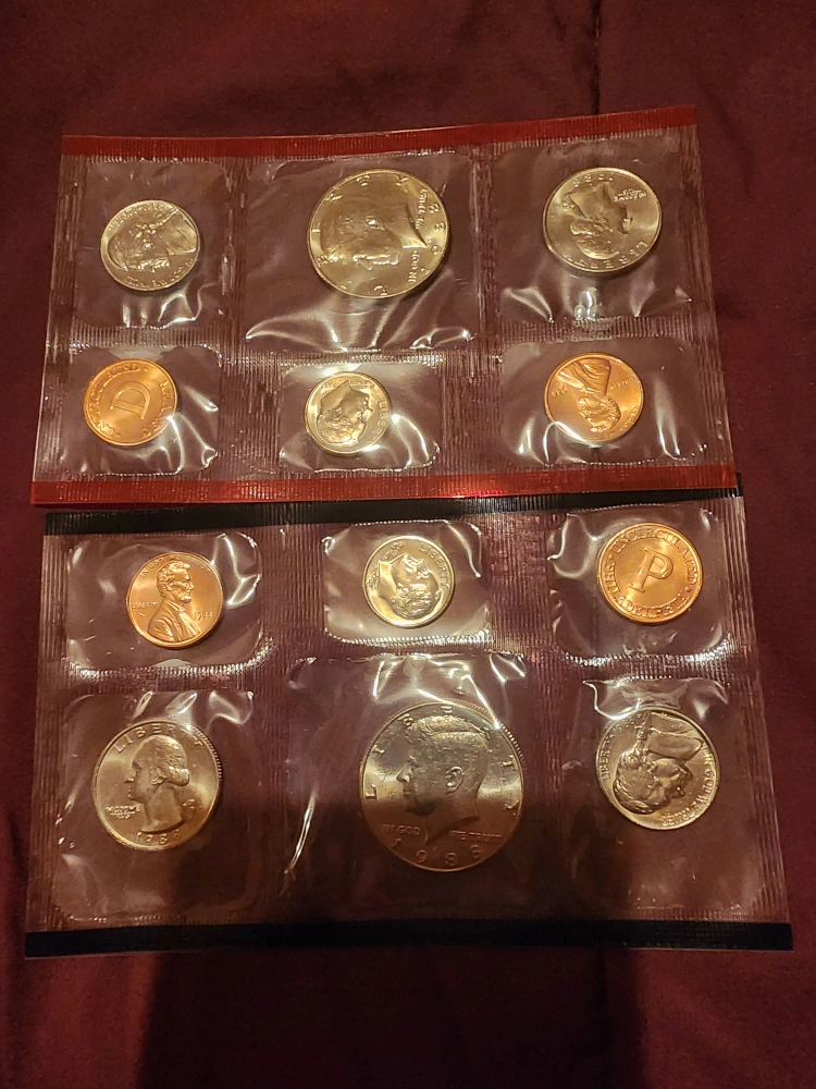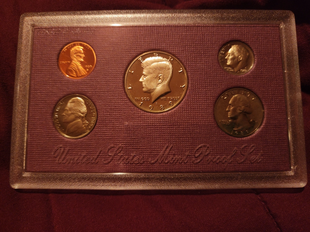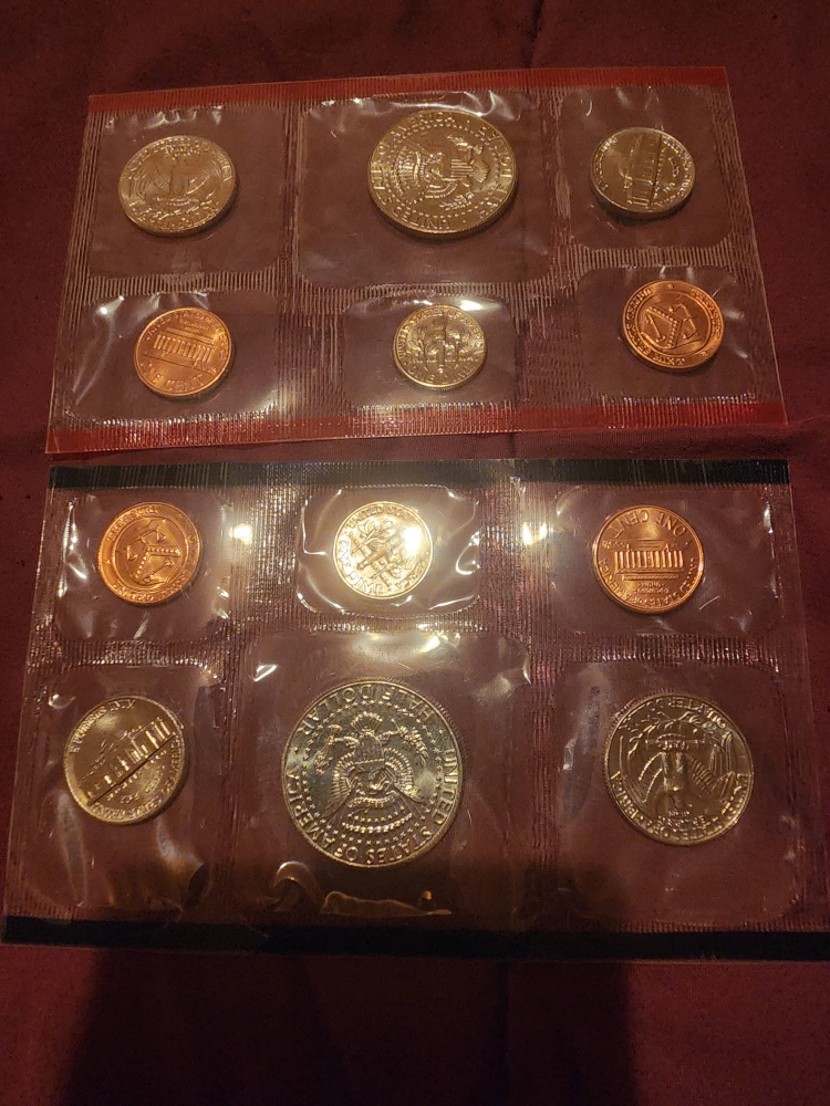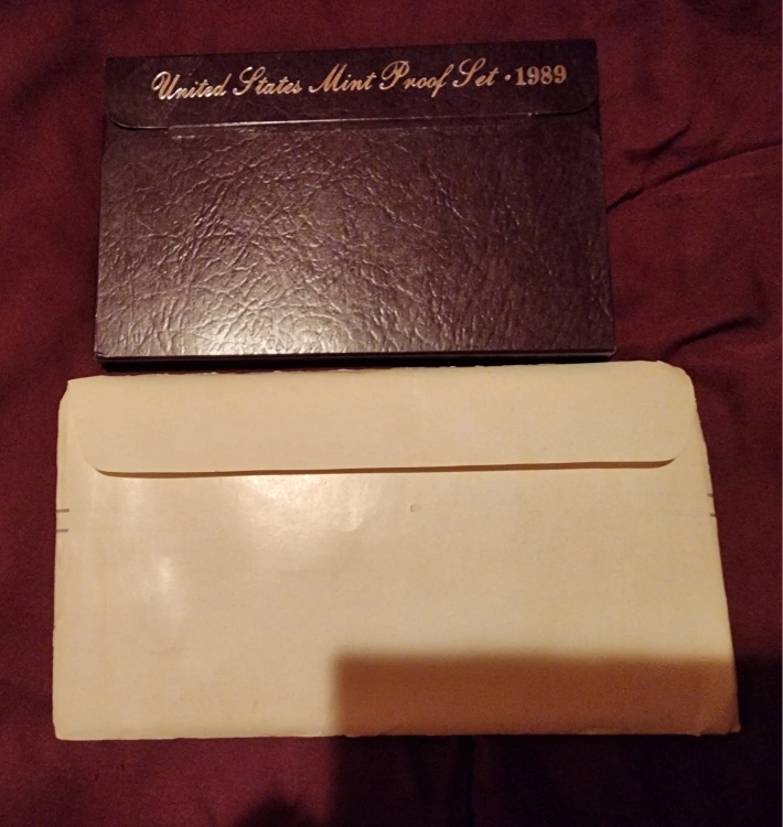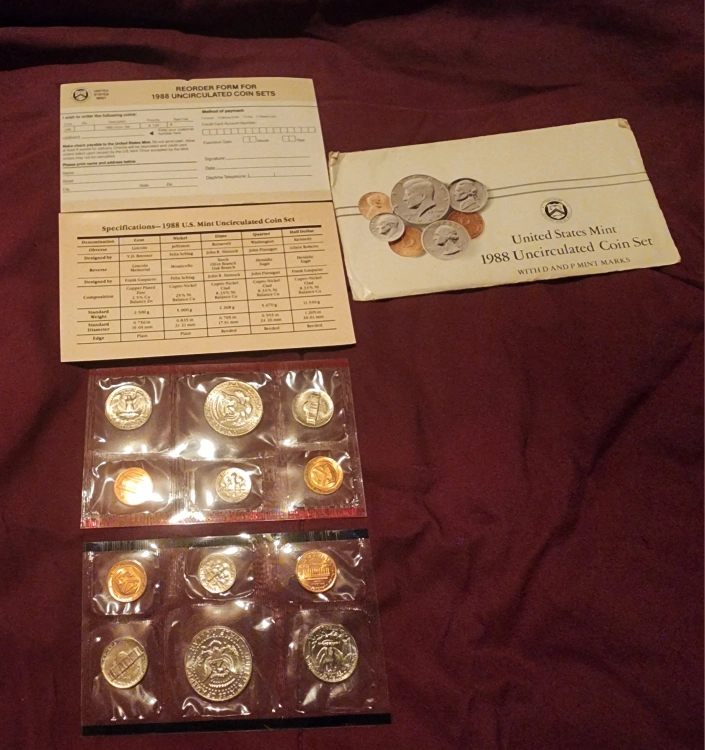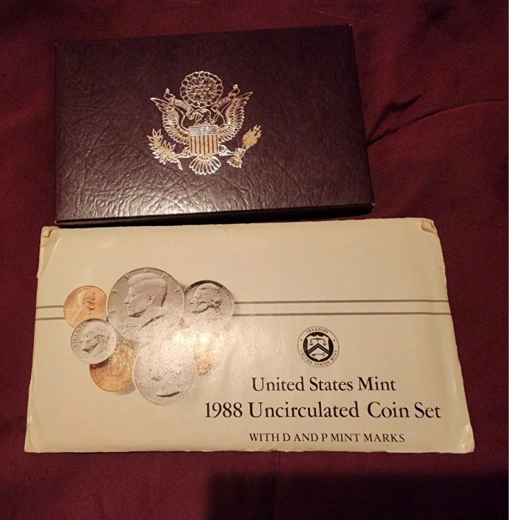 I have a selection of United States Mint Coin Sets. 1988 & 1989 The first one has coins in a protective case with a purple box. Another set is in a white envelope and has an open appearance. Mint set never opened