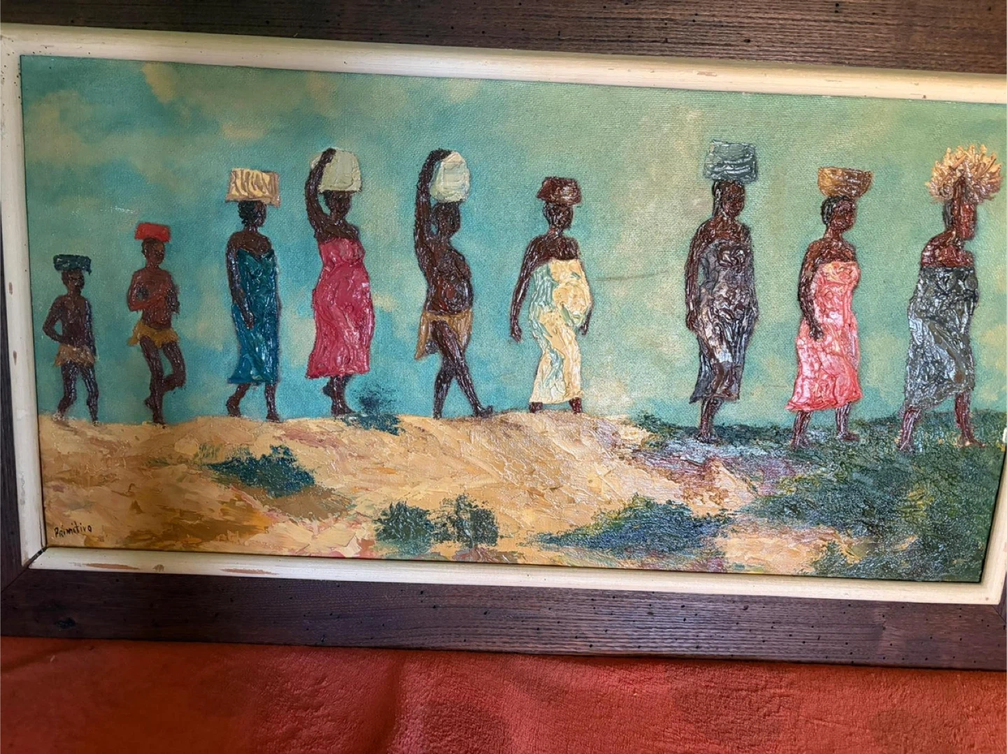 Painting is a style of folk art often associated with Haitian art. This painting, which is over 40 years old, has its flaw, making it unique (it belonged to my grandfather). It often depicts scenes of village life, such as women carrying baskets on their heads.