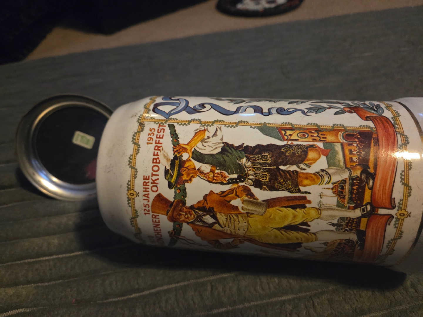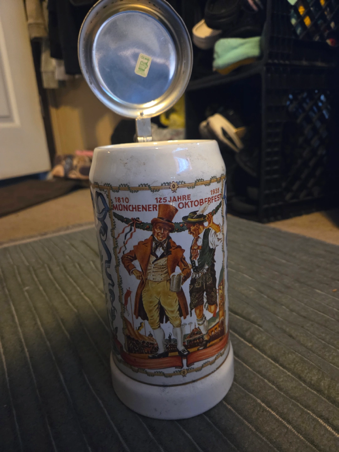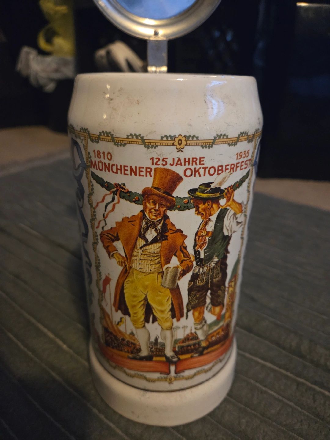 Selling a vintage Oktoberfest beer stein with a metal lid. It features a colorful design commemorating the 125th anniversary of the Munich Oktoberfest from 1810 to 1935. It's a unique piece for collectors or anyone who loves German beer culture