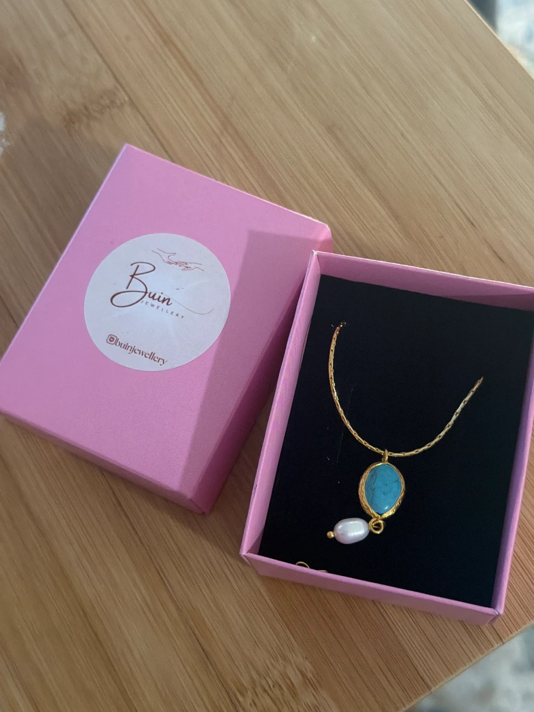 The necklace features a gold chain with a striking oval turquoise pendant and a dangling pearl accent. It comes with a pink box.