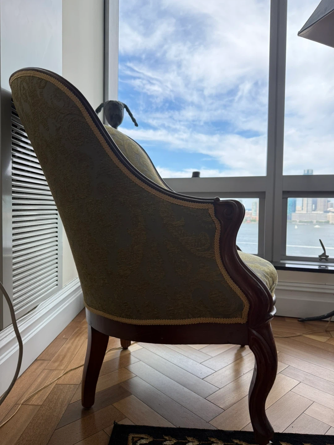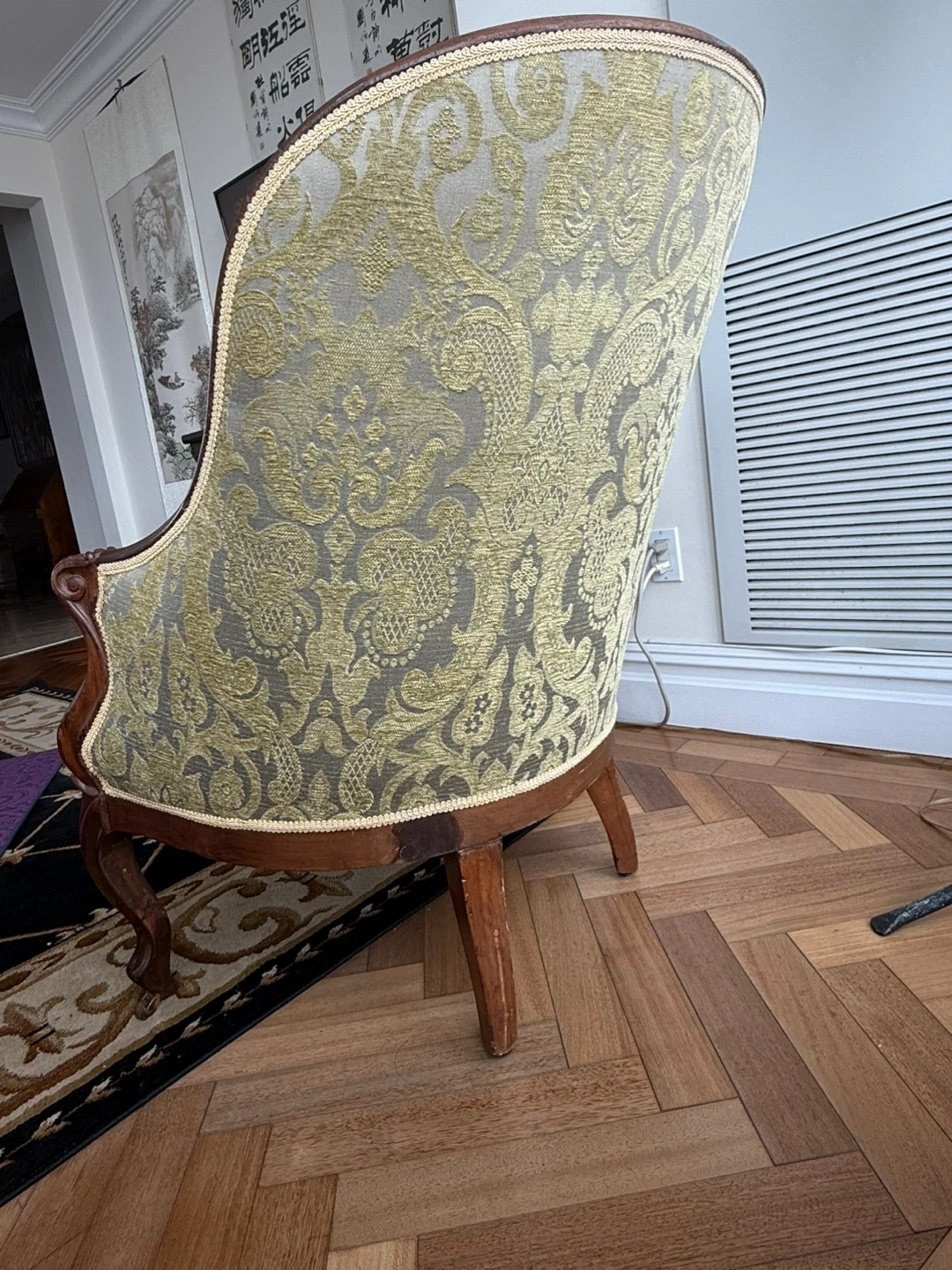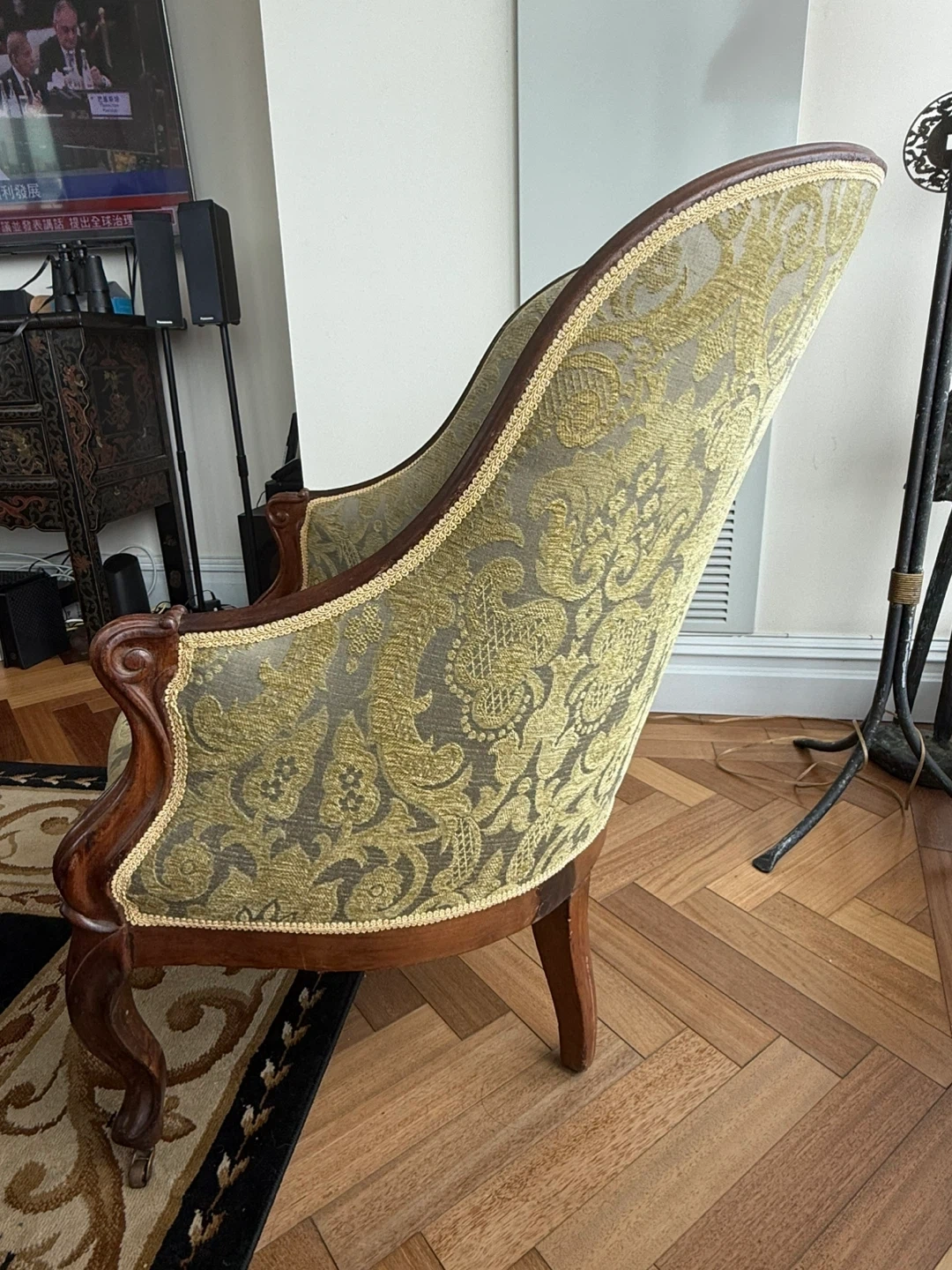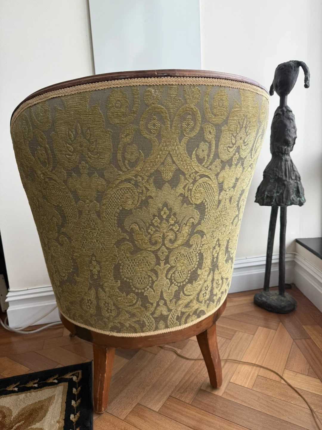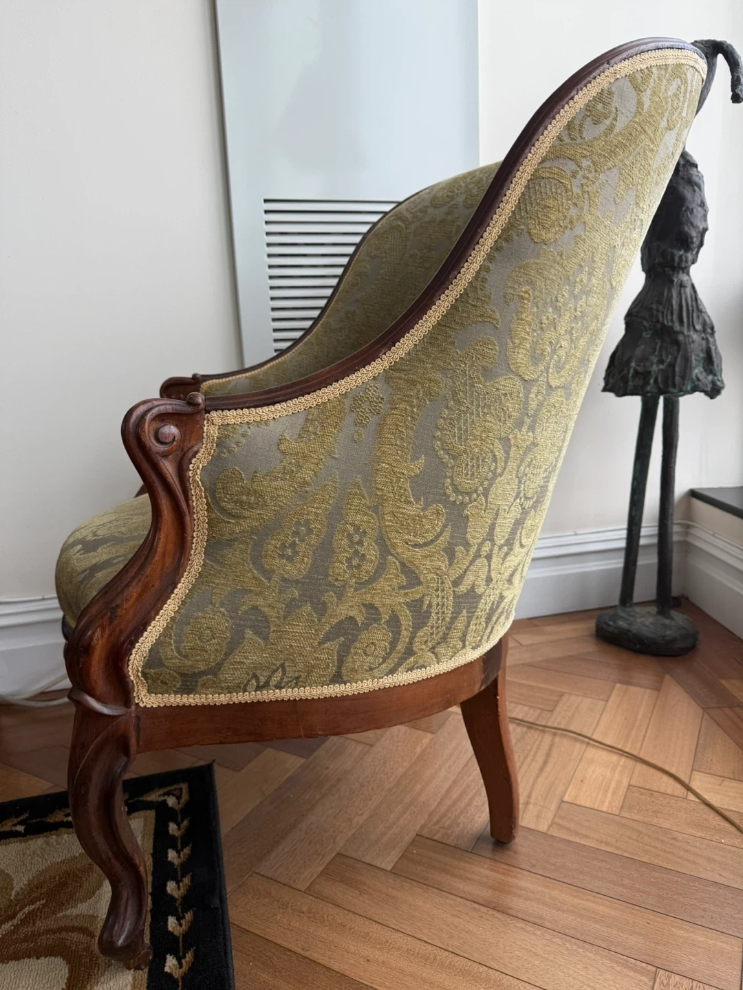Selling a vintage style armchair with a beautiful patterned fabric. The chair has a wooden frame with curved armrests and legs. The fabric is a mix of green and gold tones in a floral damask pattern. It's a lovely piece for adding a touch of elegance to any room!