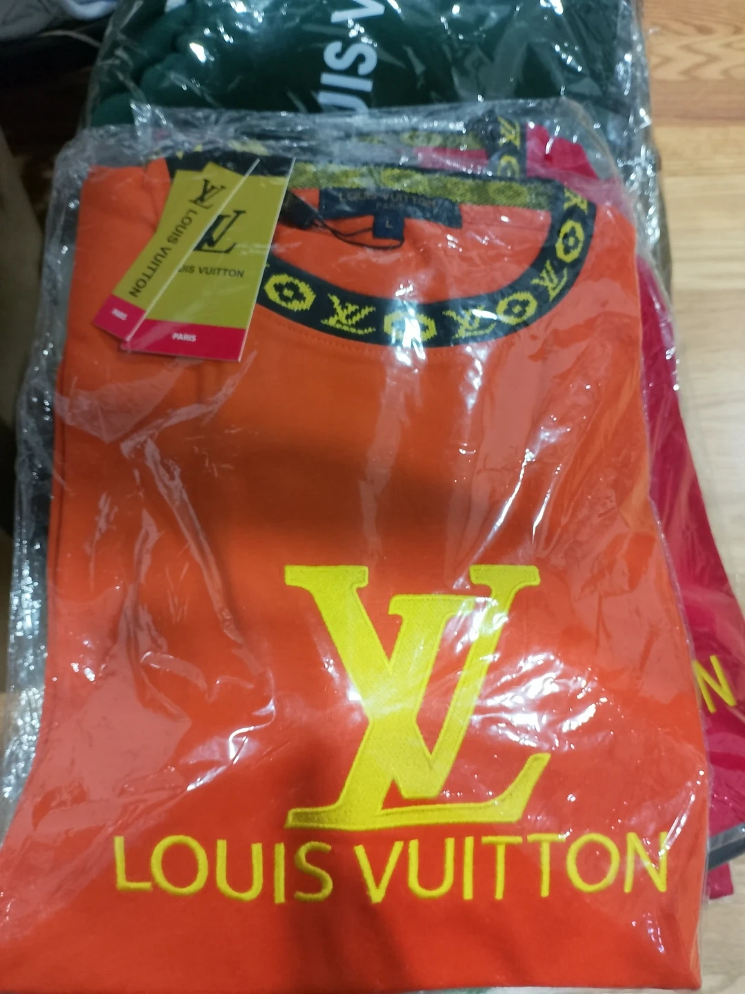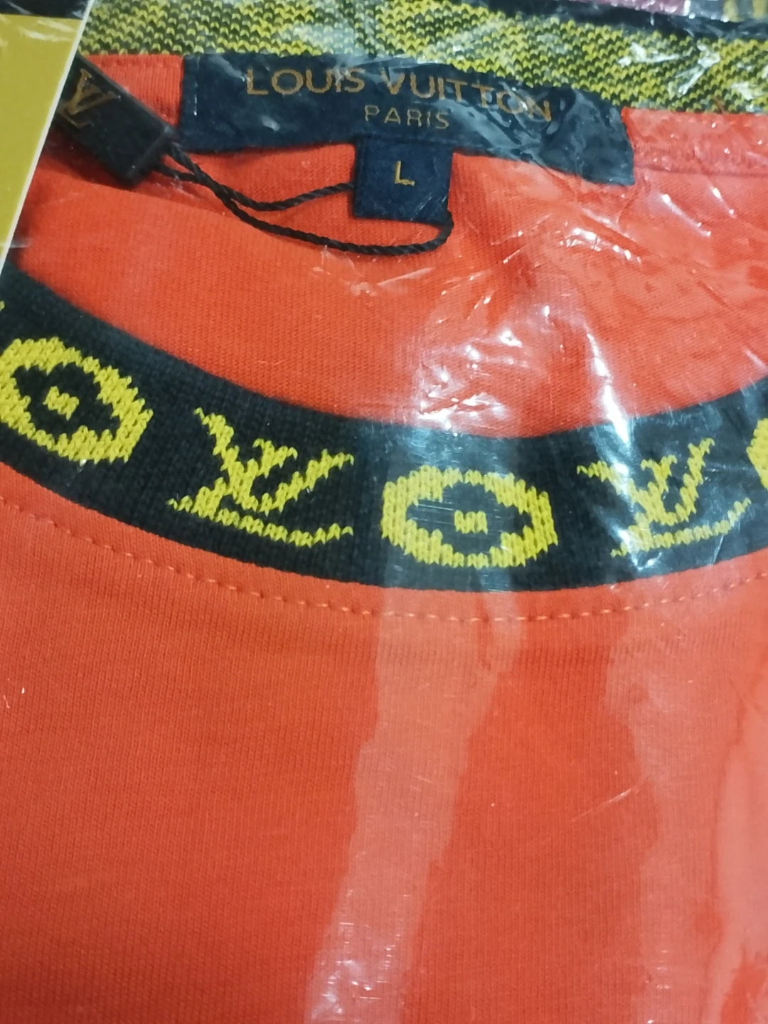 Orange Louis Vuitton t-shirt. Features the iconic LV monogram pattern around the collar and "LOUIS VUITTON" printed on the front. Size L. Still in original packaging.