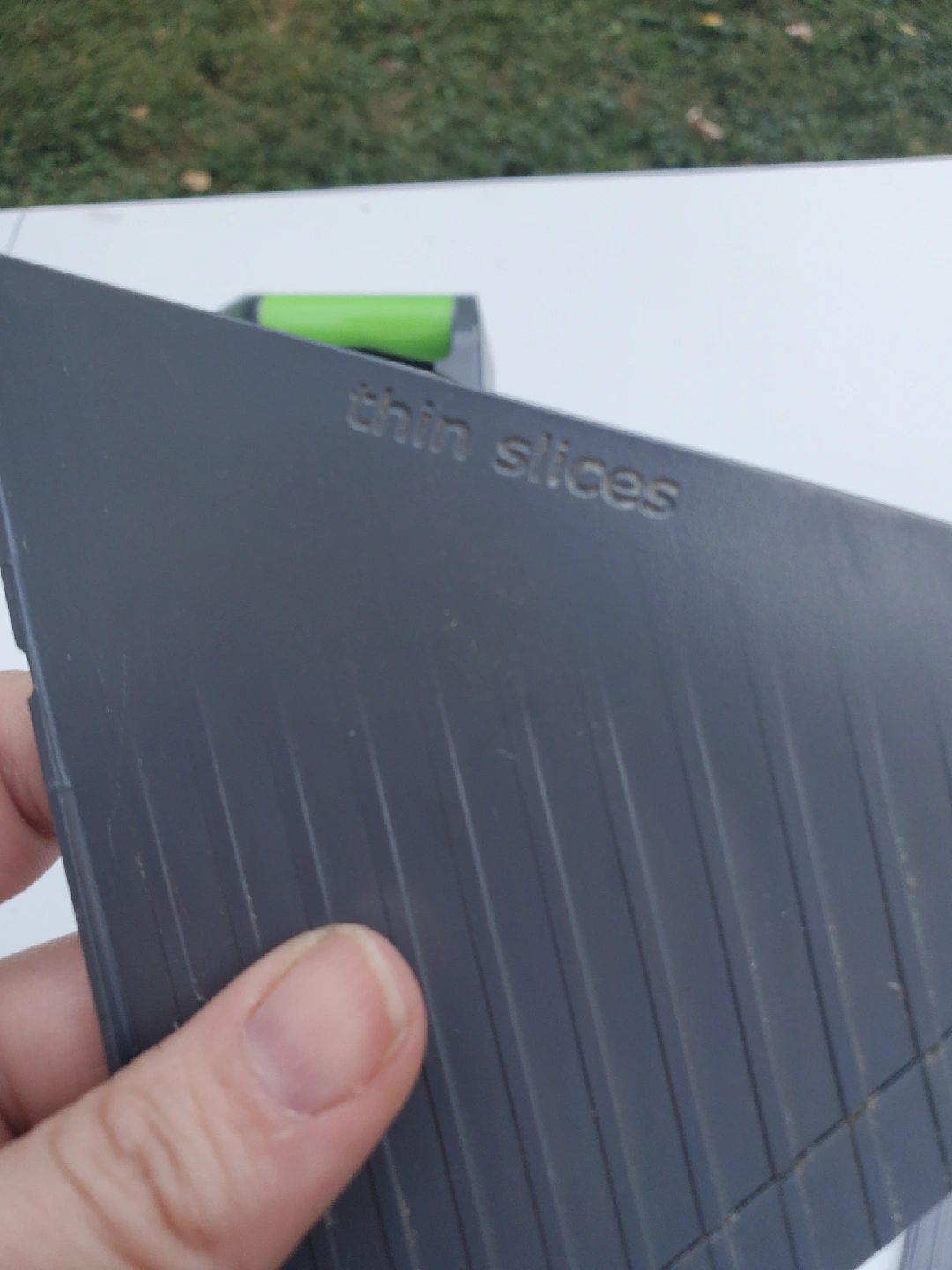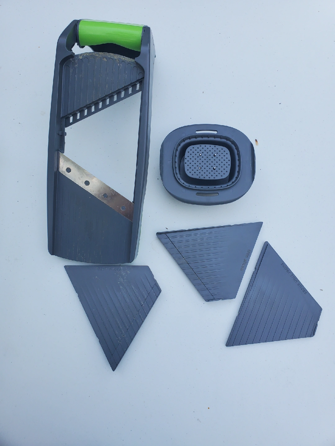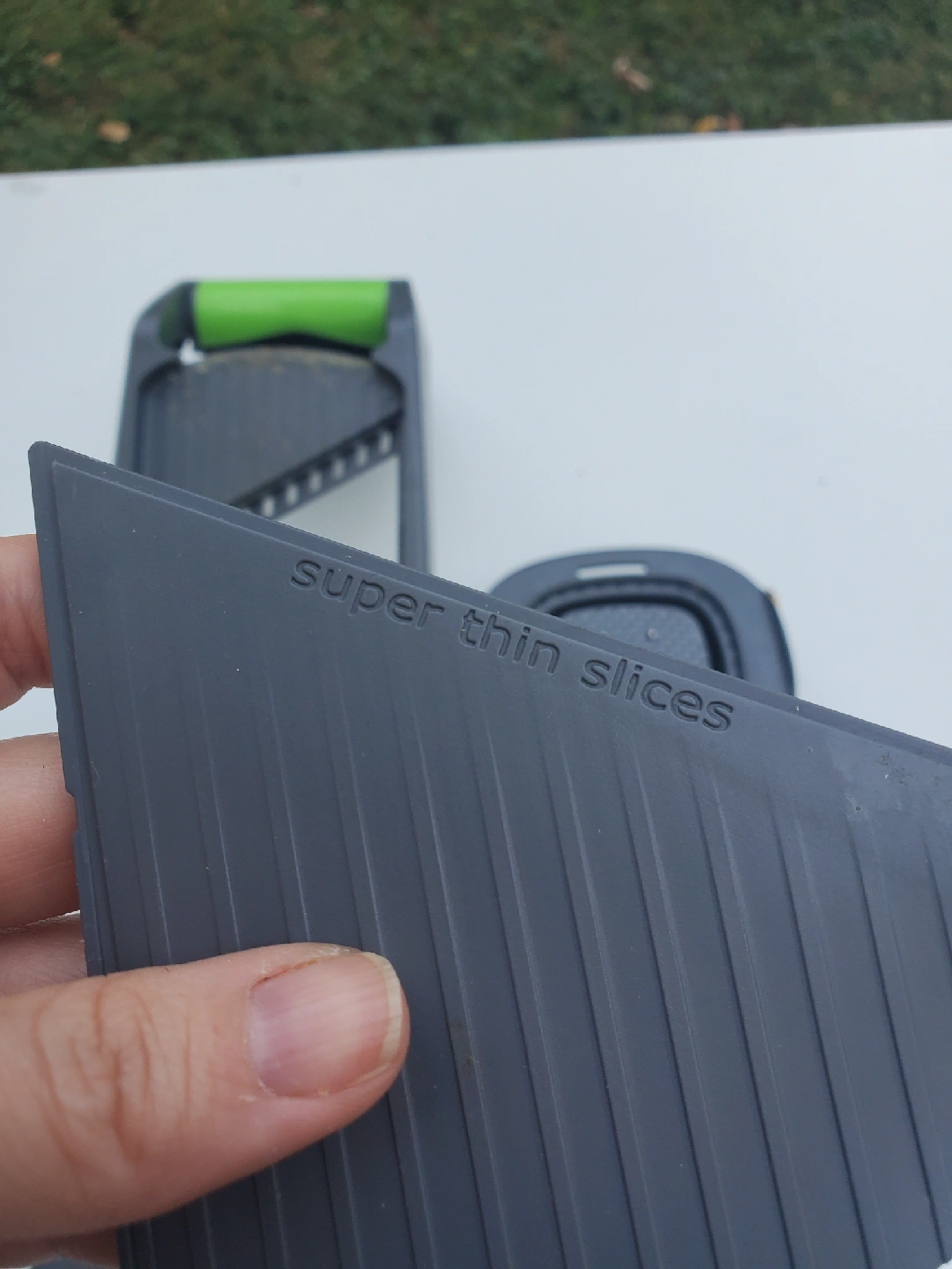 I'm selling an adjustable mandoline food slicer. It has settings for both thick and super thin slices. Great for getting consistent cuts in the kitchen!