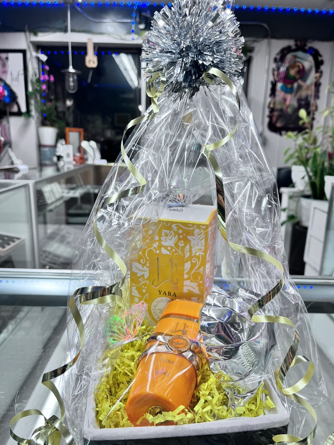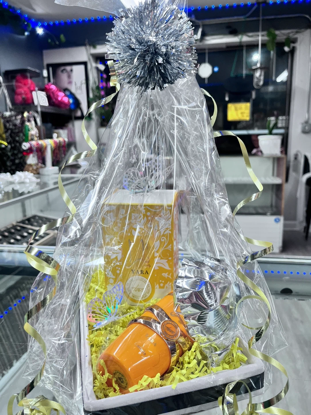Gift basket featuring YARA perfume with an orange-colored bottle and a decorative box. Includes what appears to be a metallic silver accessory. Ready for gifting! Areglo con perfume aka venta