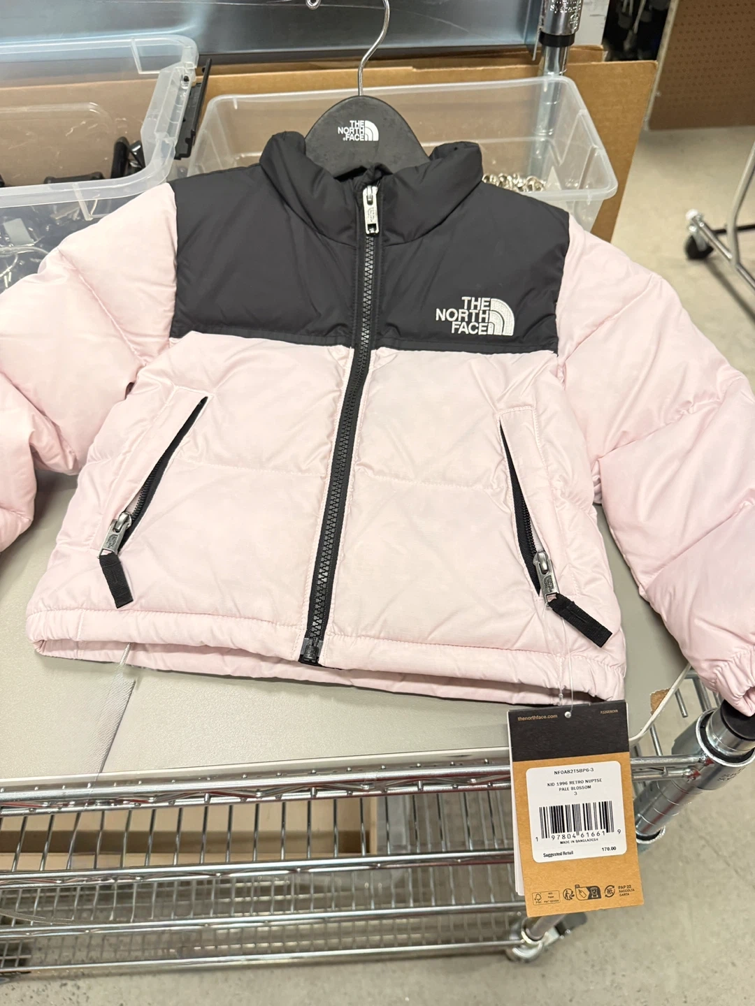 This is a North Face Kids Retro Nuptse puffer jacket in pale blossom pink and black. It features a full zip front and zippered pockets. A warm and stylish option for your little one! Size 3t color is sold out