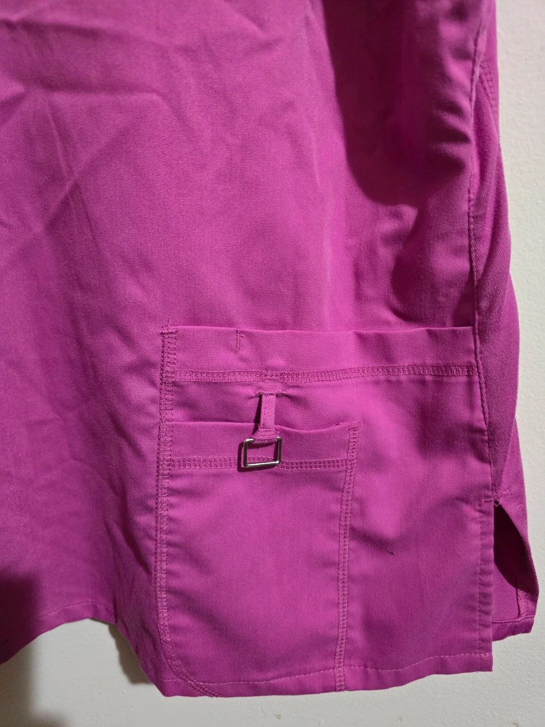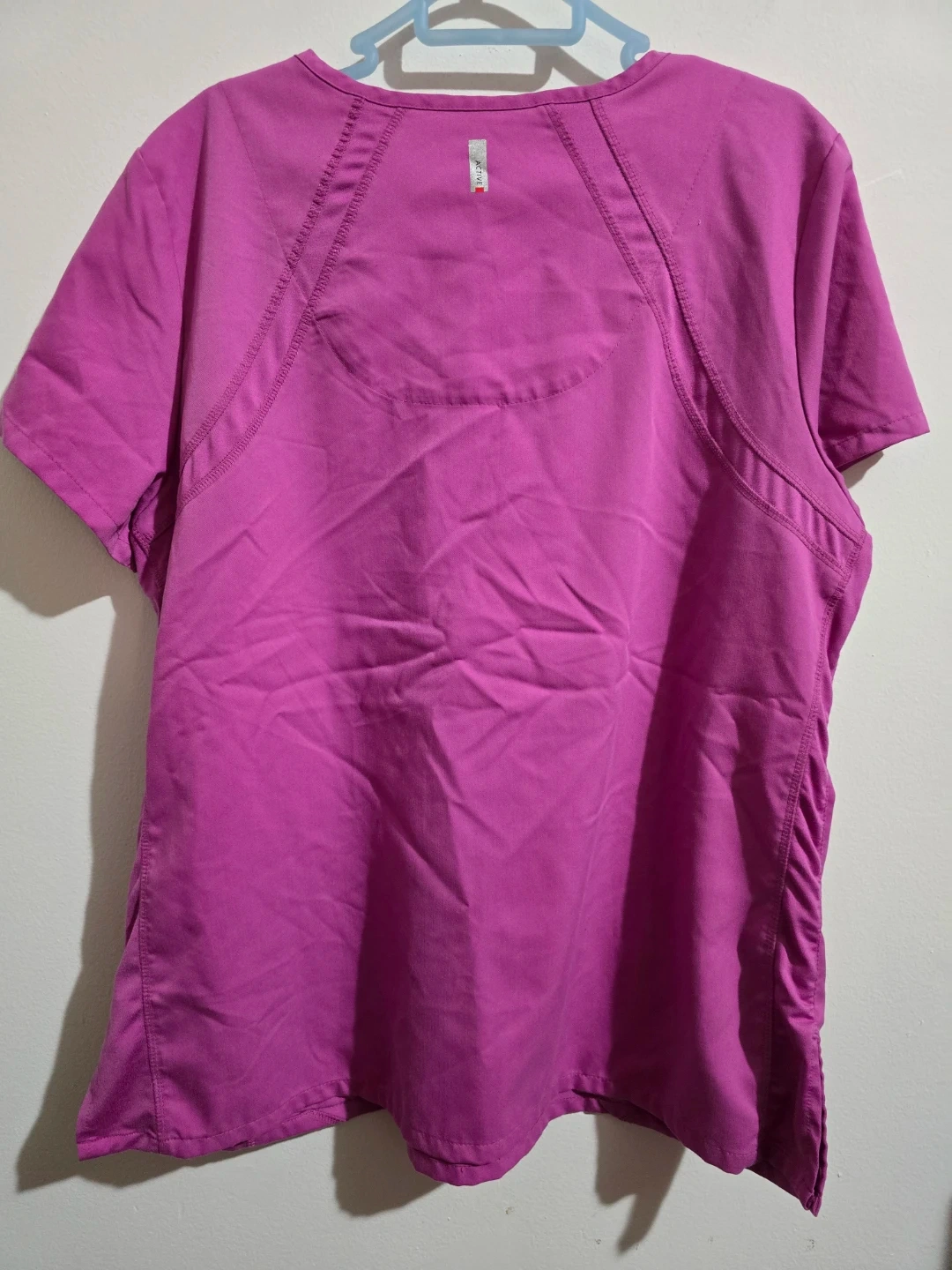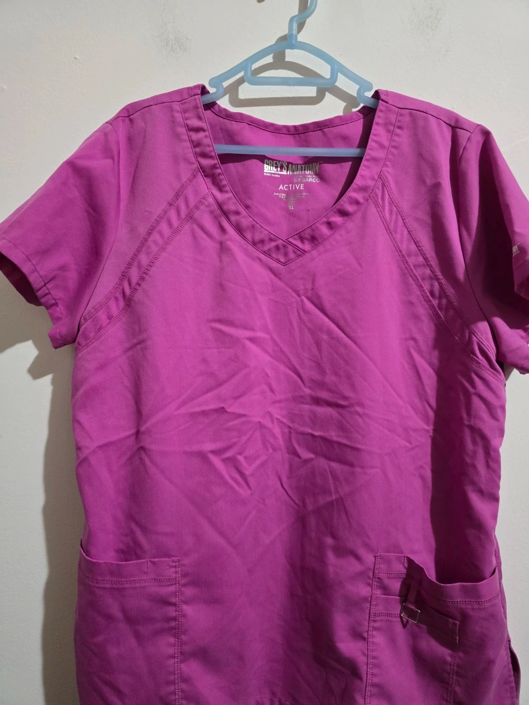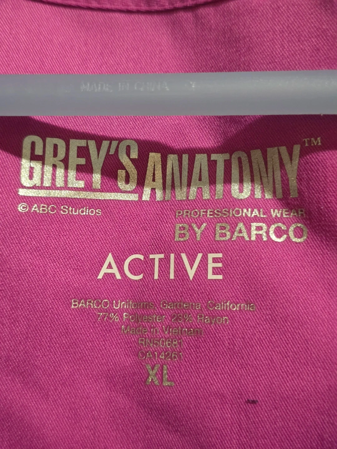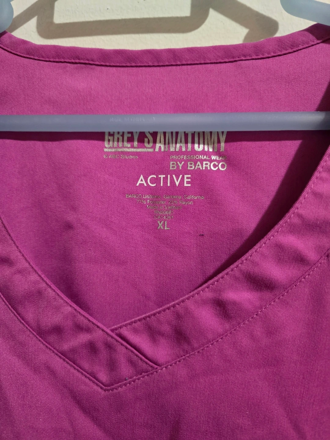 This is a Grey's Anatomy Professional Wear scrub top in size XL. It's a vibrant purple color and made from a blend of polyester and rayon. This top is designed for active wear.