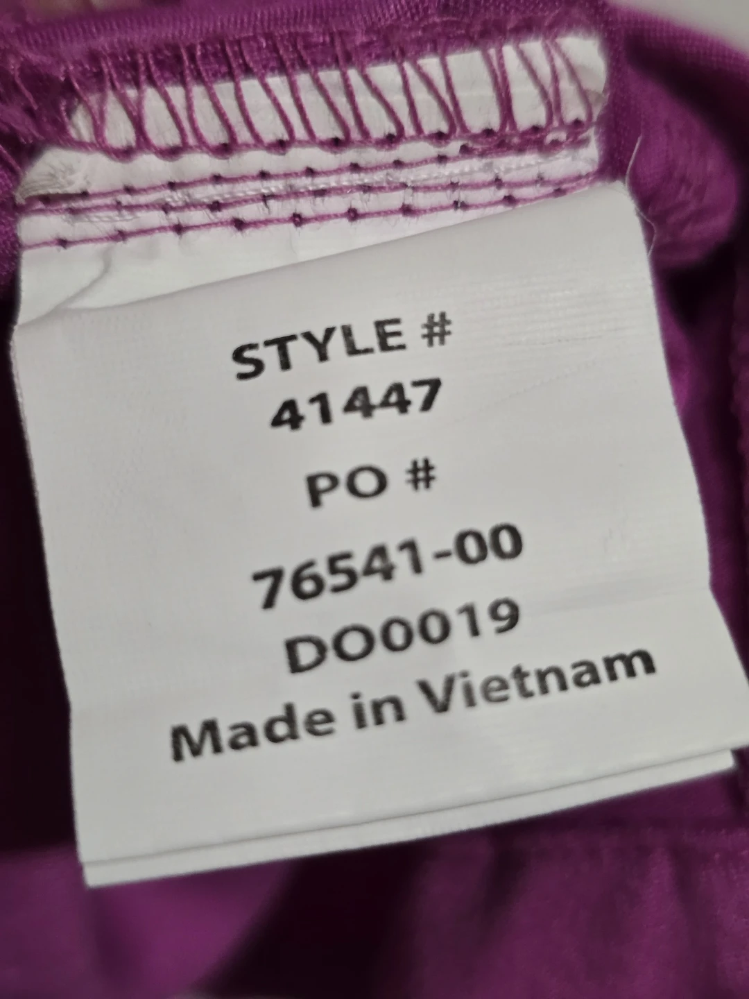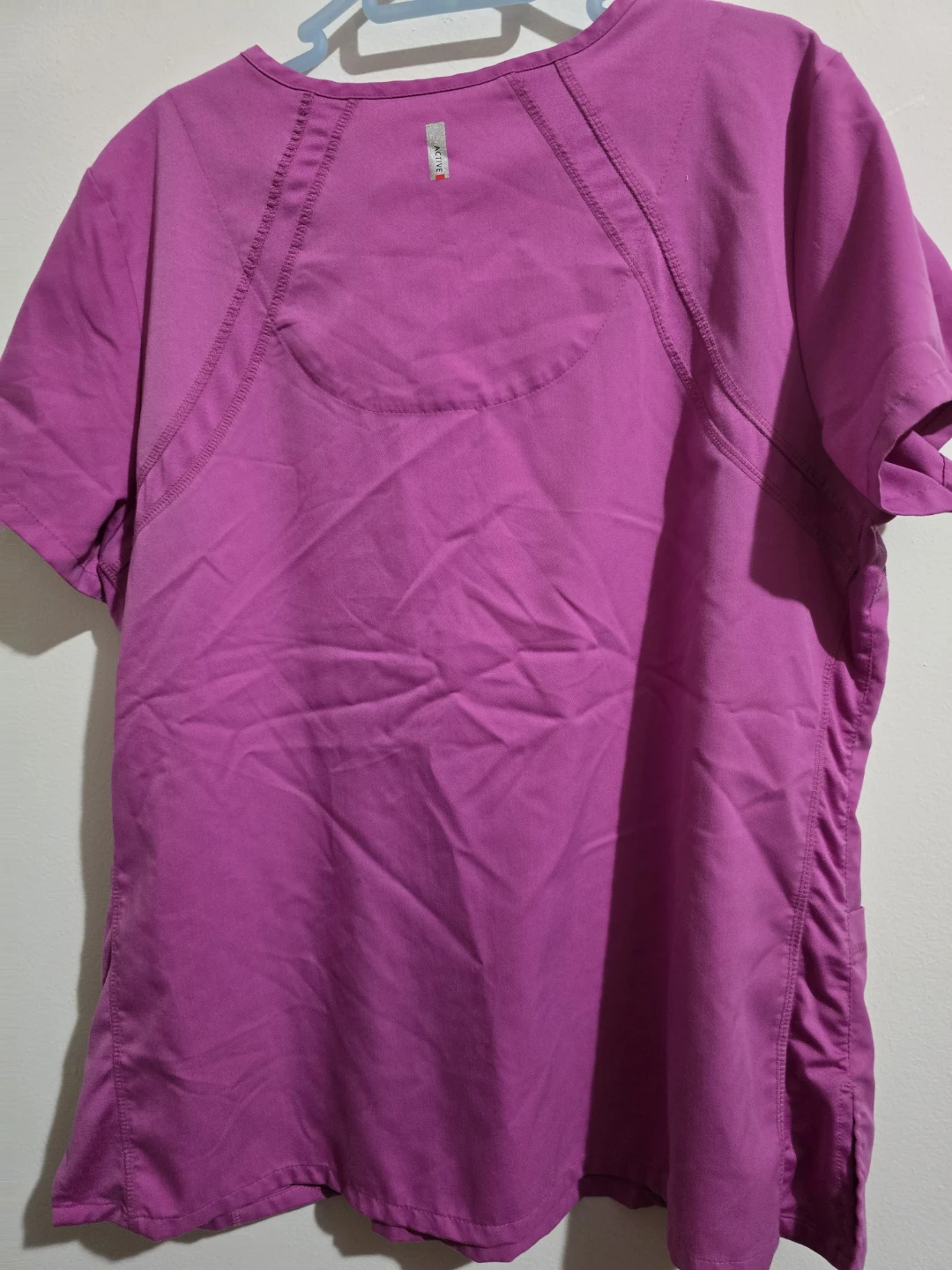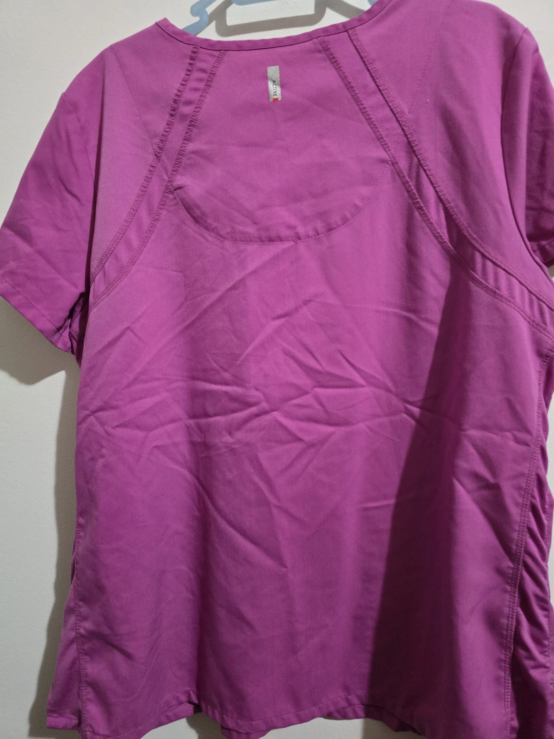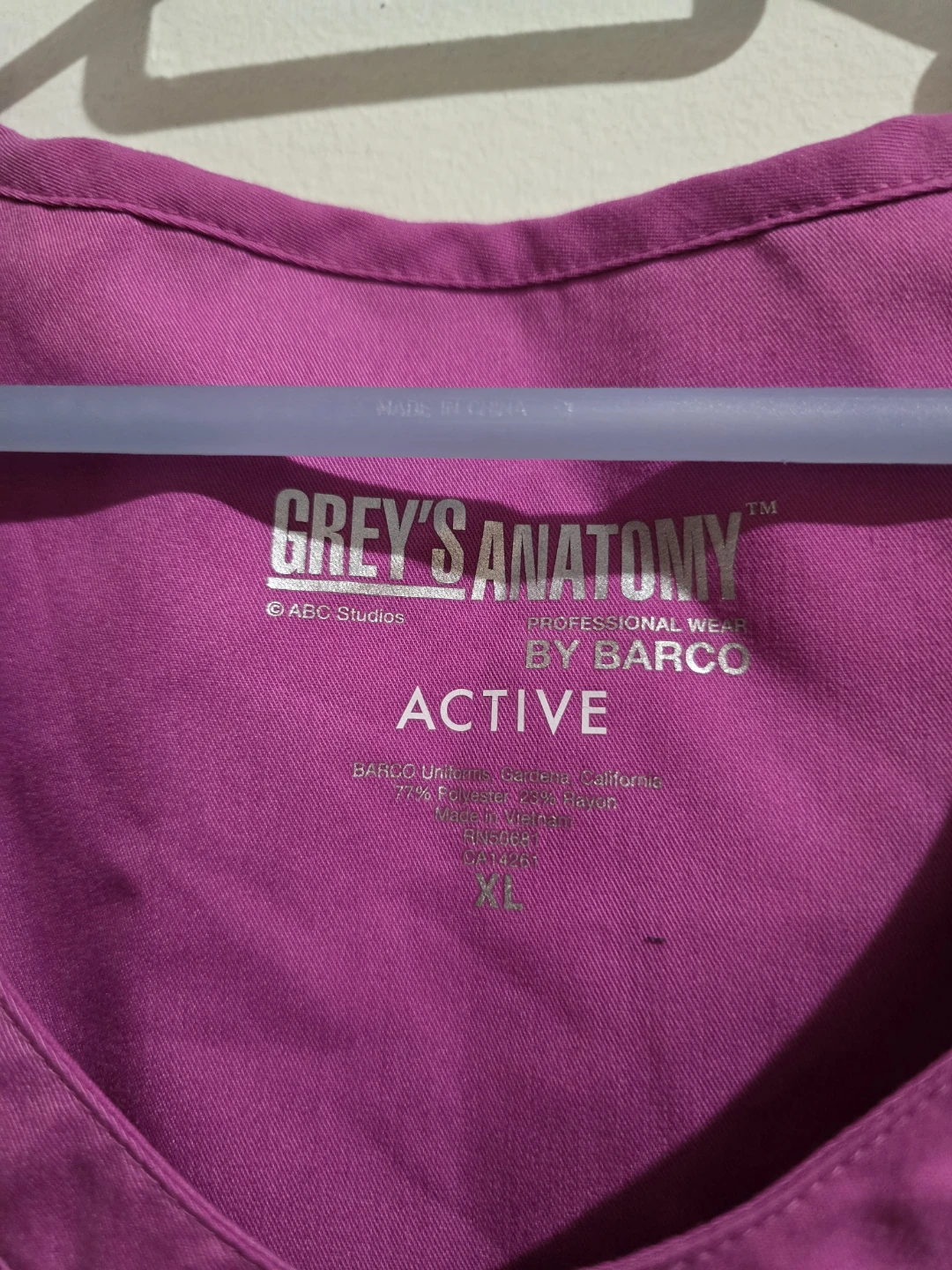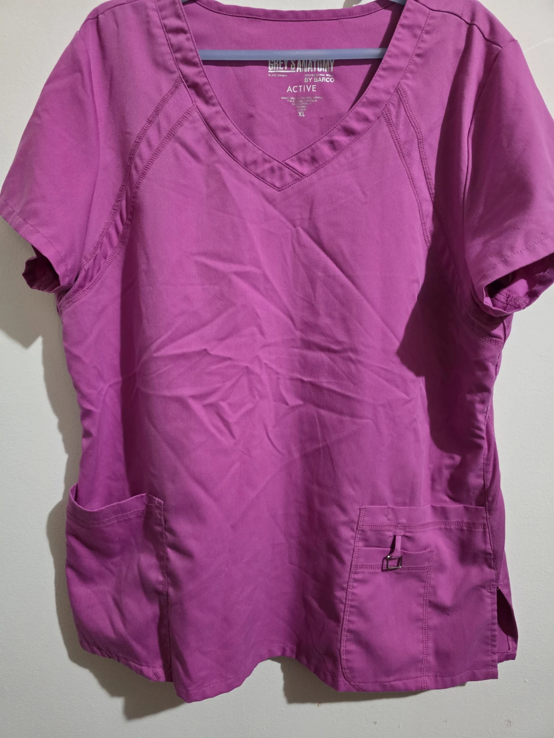 This is a Grey's Anatomy Professional Wear scrub top in size XL. It's a vibrant purple color and made from a blend of polyester and rayon. This top is designed for active wear.