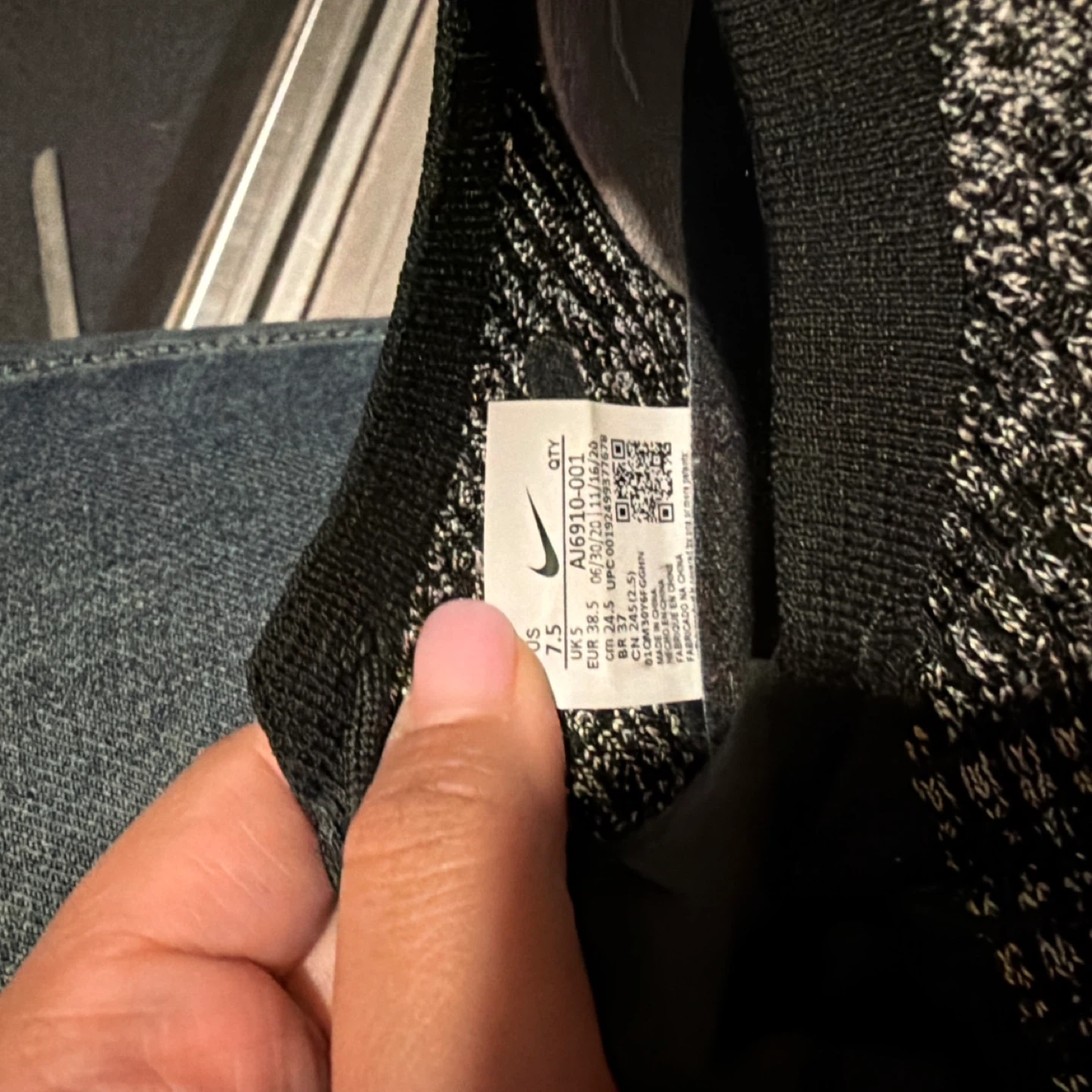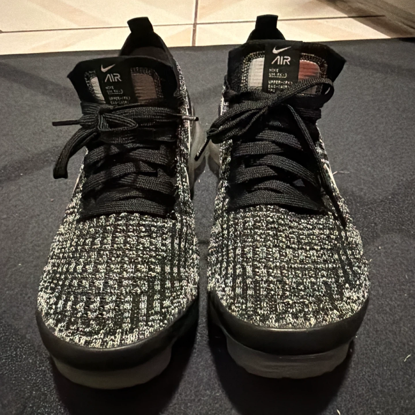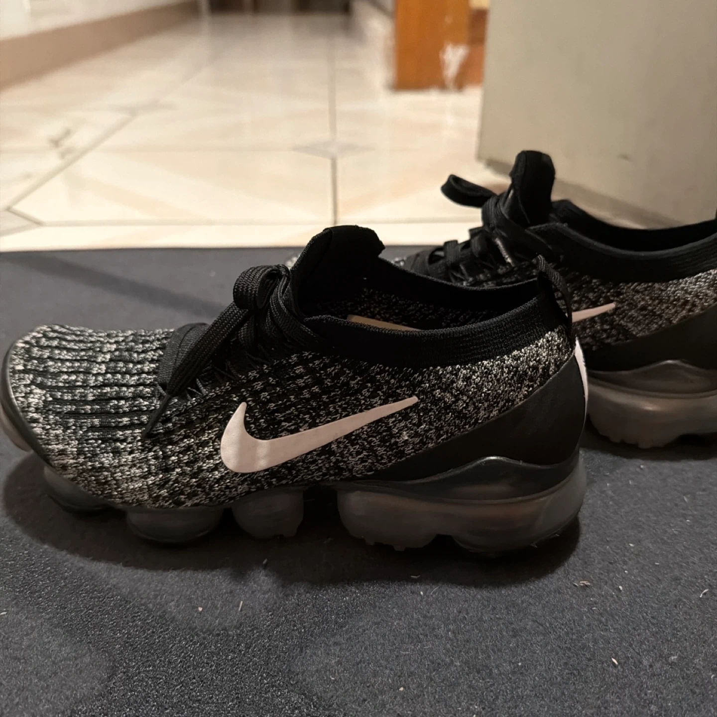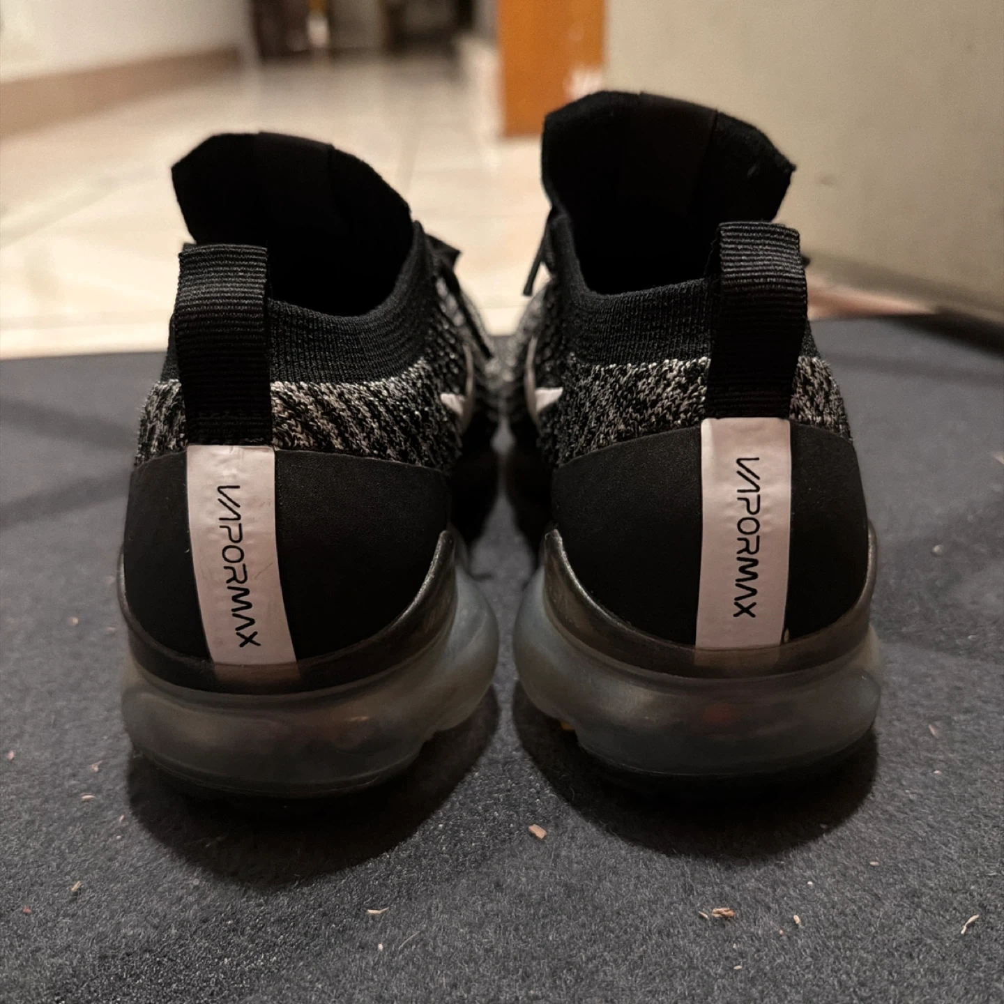 Nike Air VaporMax 2021 Flyknit shoes. Features a black and white knit upper with a translucent VaporMax air sole. Women's US size 7.5.