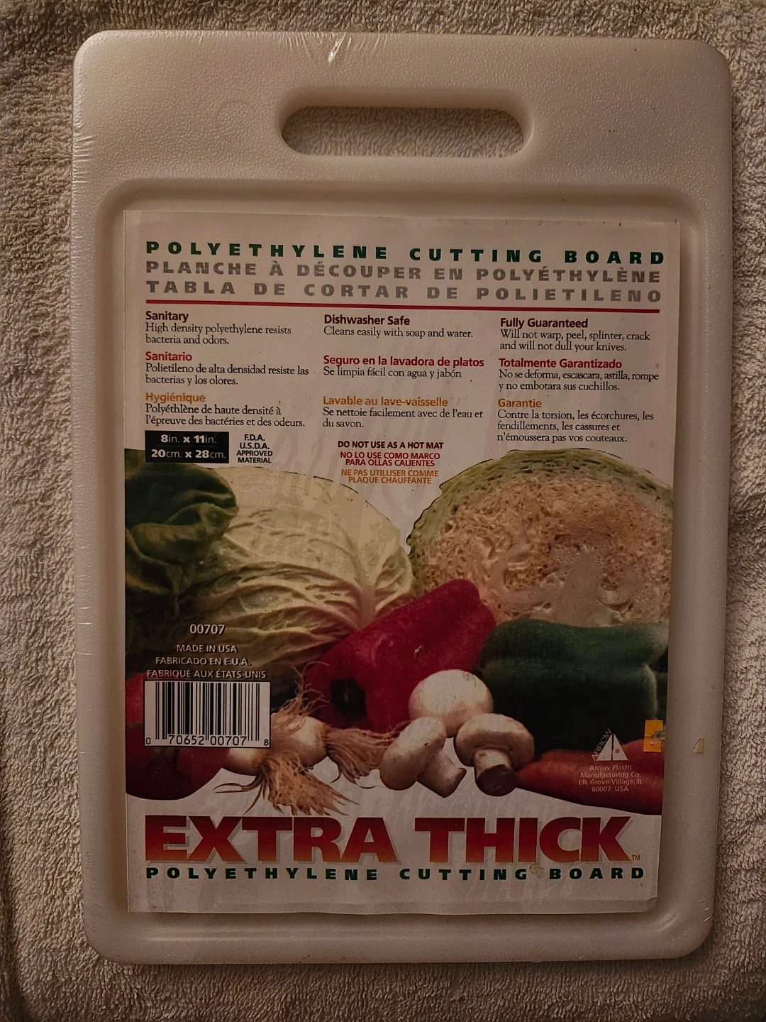 FACTORY SEALED. Polyethylene cutting board, 8in x 11in. High density polyethylene resists stains and odors. Dishwasher safe. NO Halfpricers or lows.