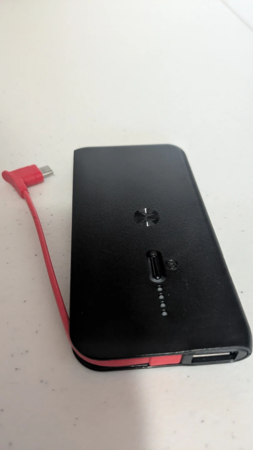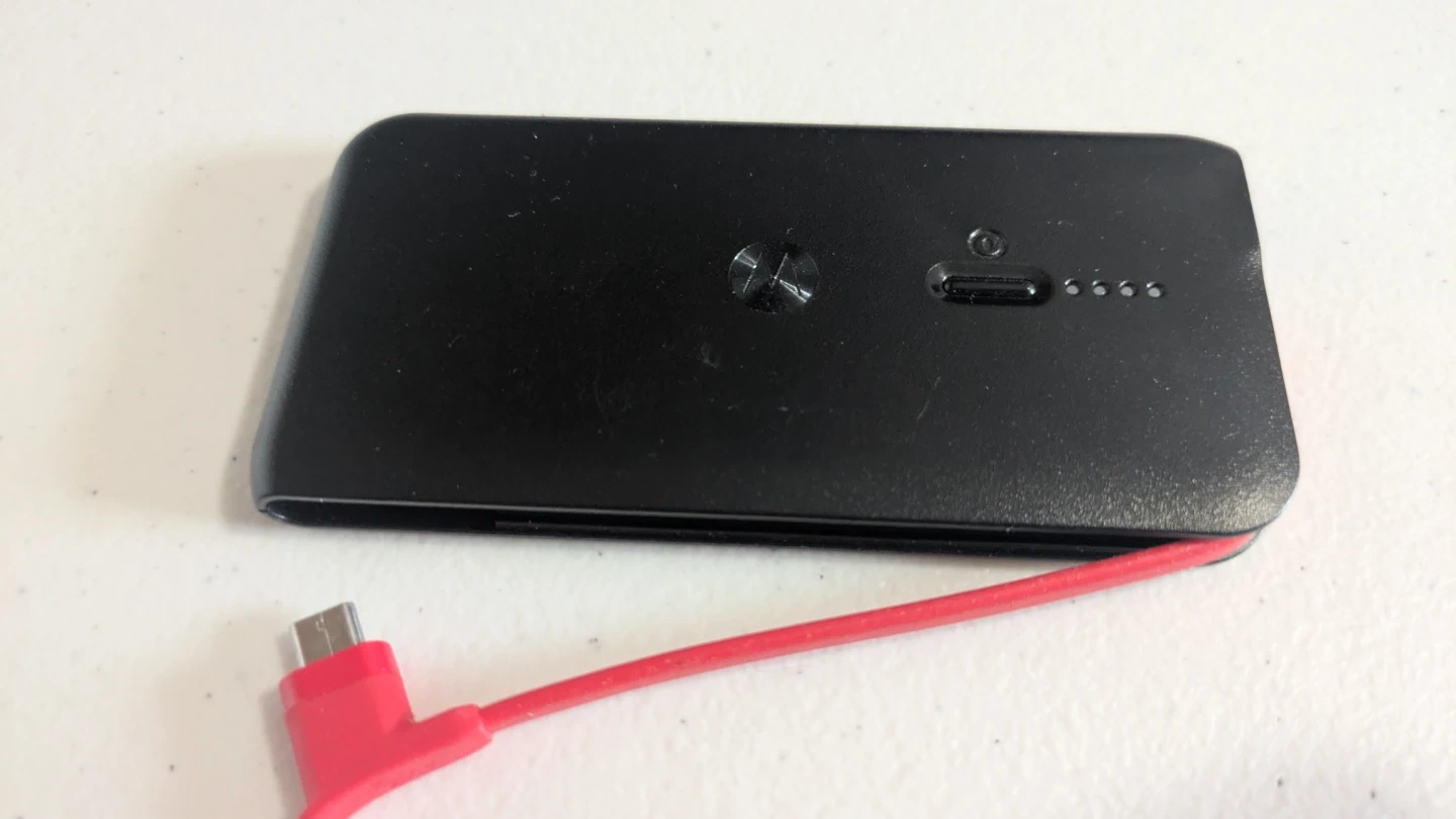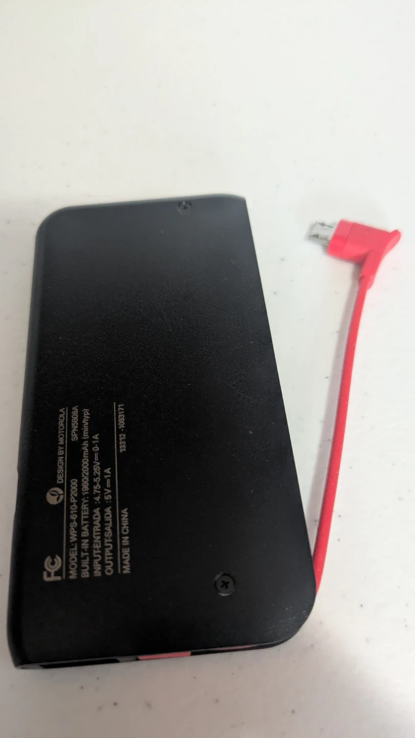 Portable power bank by Motorola. Built-in battery: 1900mAh. Input/output: 5V/0.1A. Includes integrated red charging cable.