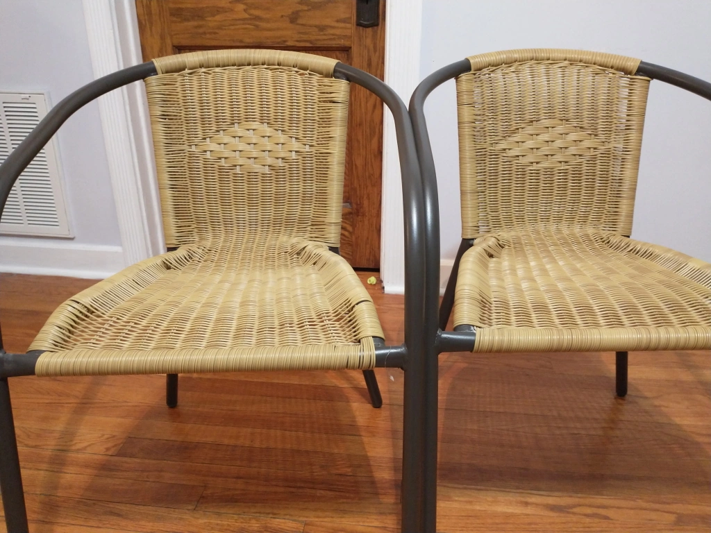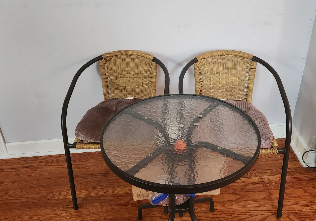 This patio set includes two chairs with woven wicker backs and seat cushions, along with a round glass-top table. It's perfect for small outdoor spaces like balconies or patios. The set offers a charming and comfortable spot for relaxation. Never used outside always kept inside. Table is approximately 23.5 inches width and 27.5 inches height. Chairs approx. 29 inches height and 21 inches width.