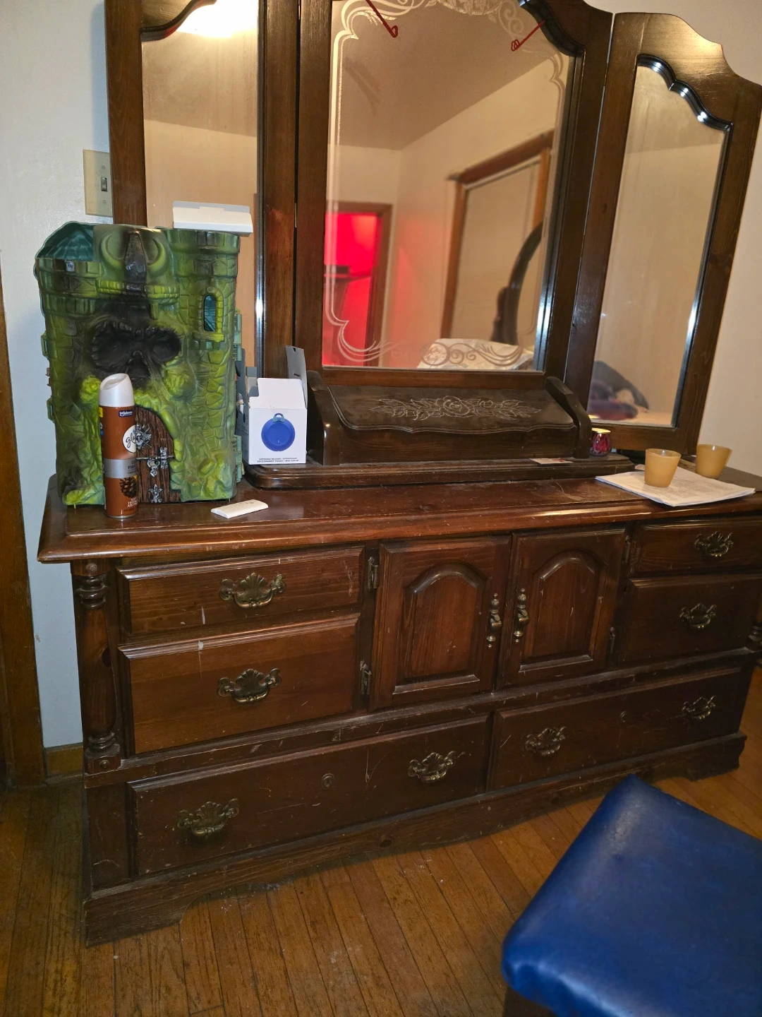 This vintage dresser features a tri-fold mirror and ample drawer storage. It's crafted from dark wood with ornate brass hardware. The top surface offers space for decor. This dresser would be a great addition to a bedroom.