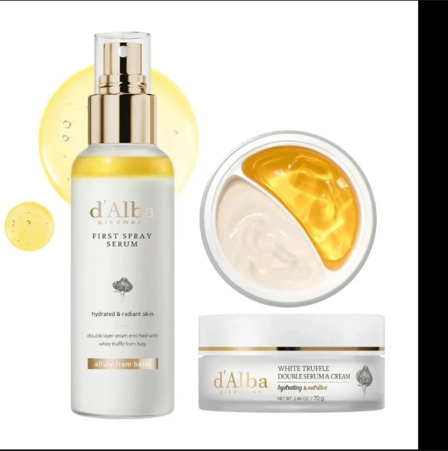 I'm selling a d'Alba set that includes the First Spray Serum and the White Truffle Double Serum & Cream. The serum is a double-layer serum enriched with white truffle from Italy, perfect for hydrated and radiant skin. The cream is hydrating and nutritive. Net weight of the cream is 2.46 oz / 70 g