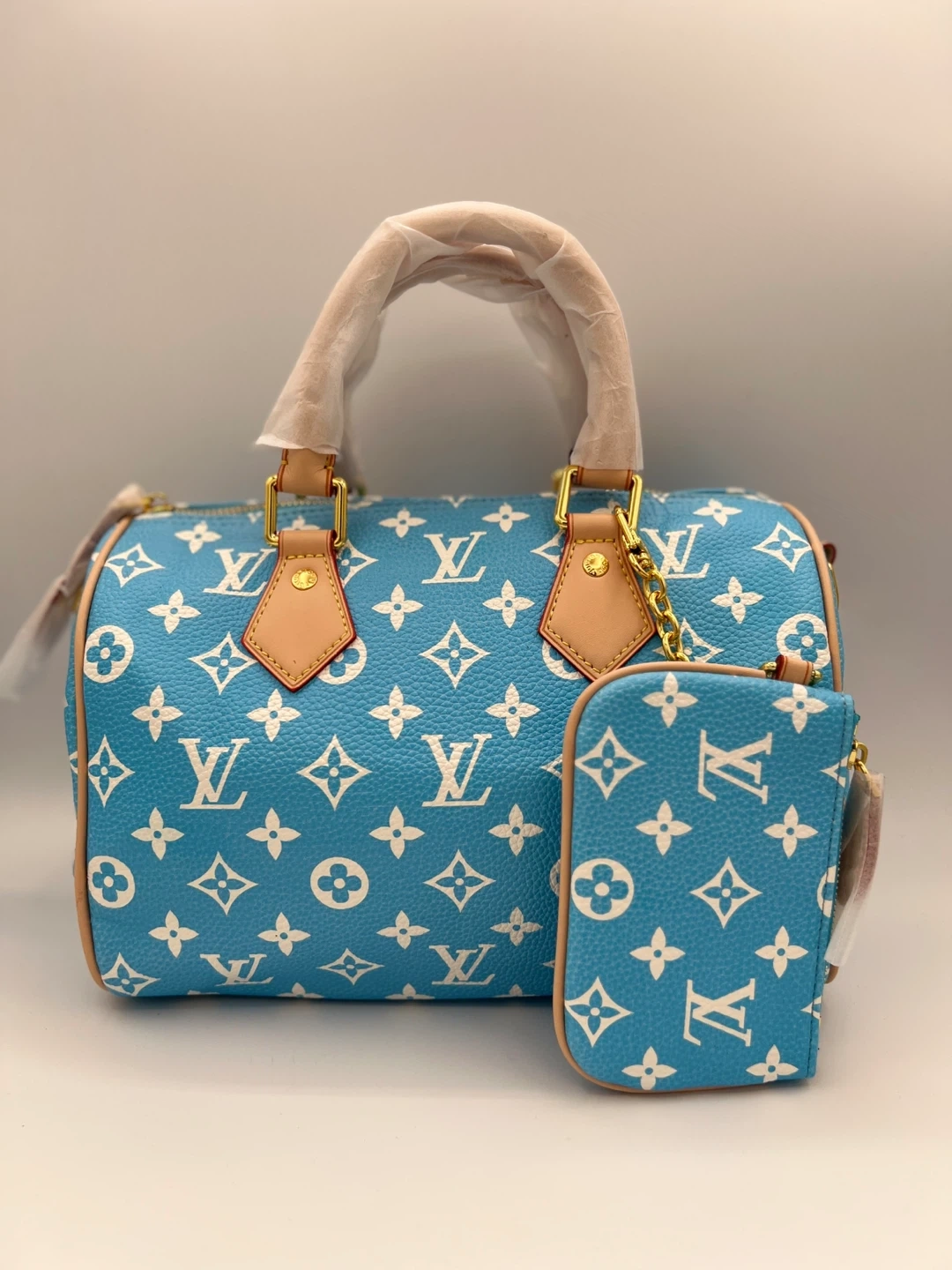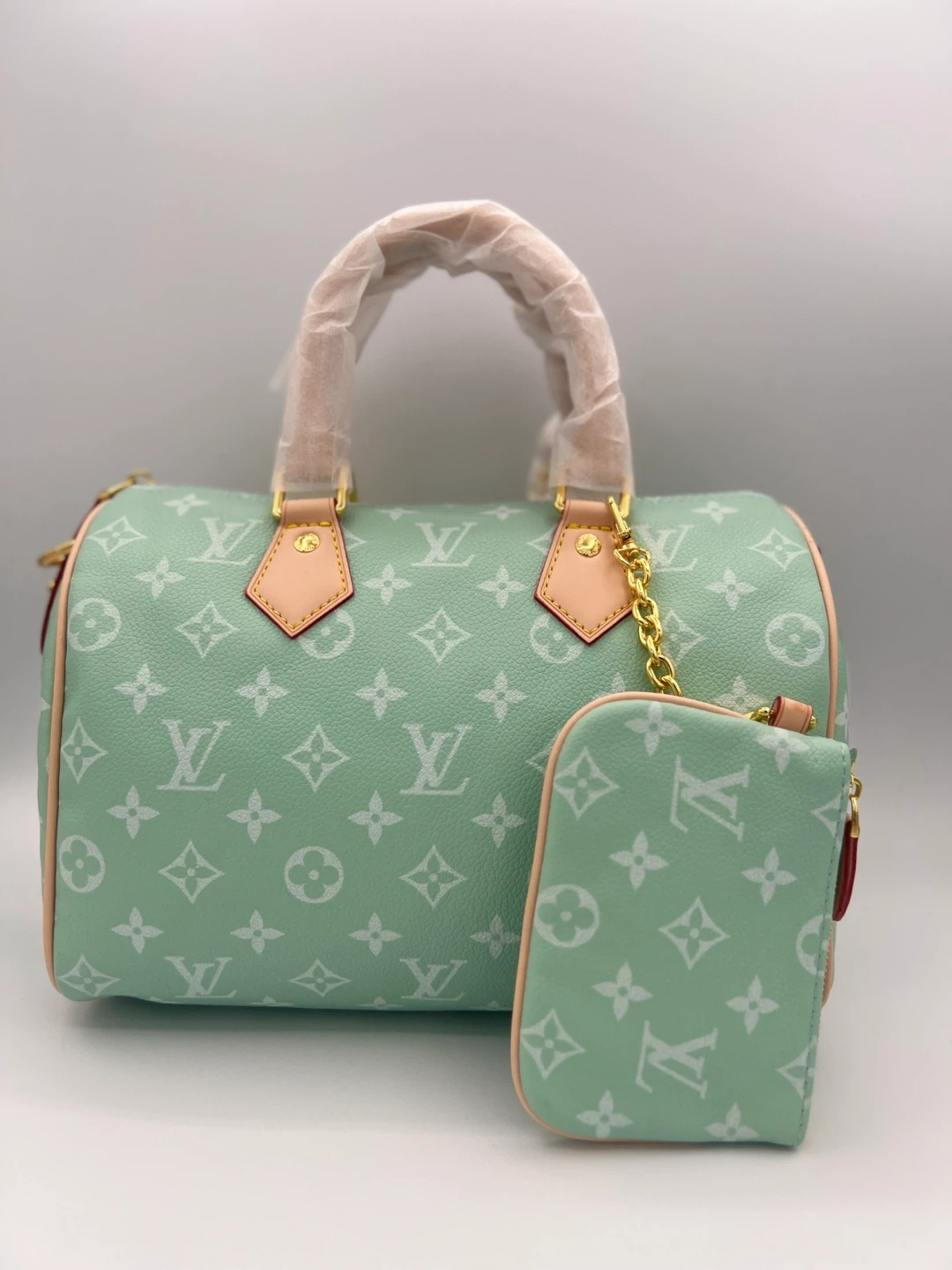 Monogrammed Speedy P9 handbag and matching pouch. Available in fuchsia, sky blue, or mint green. Leather trim and handles with gold-tone chain accent. Includes protective wrapping on handles.