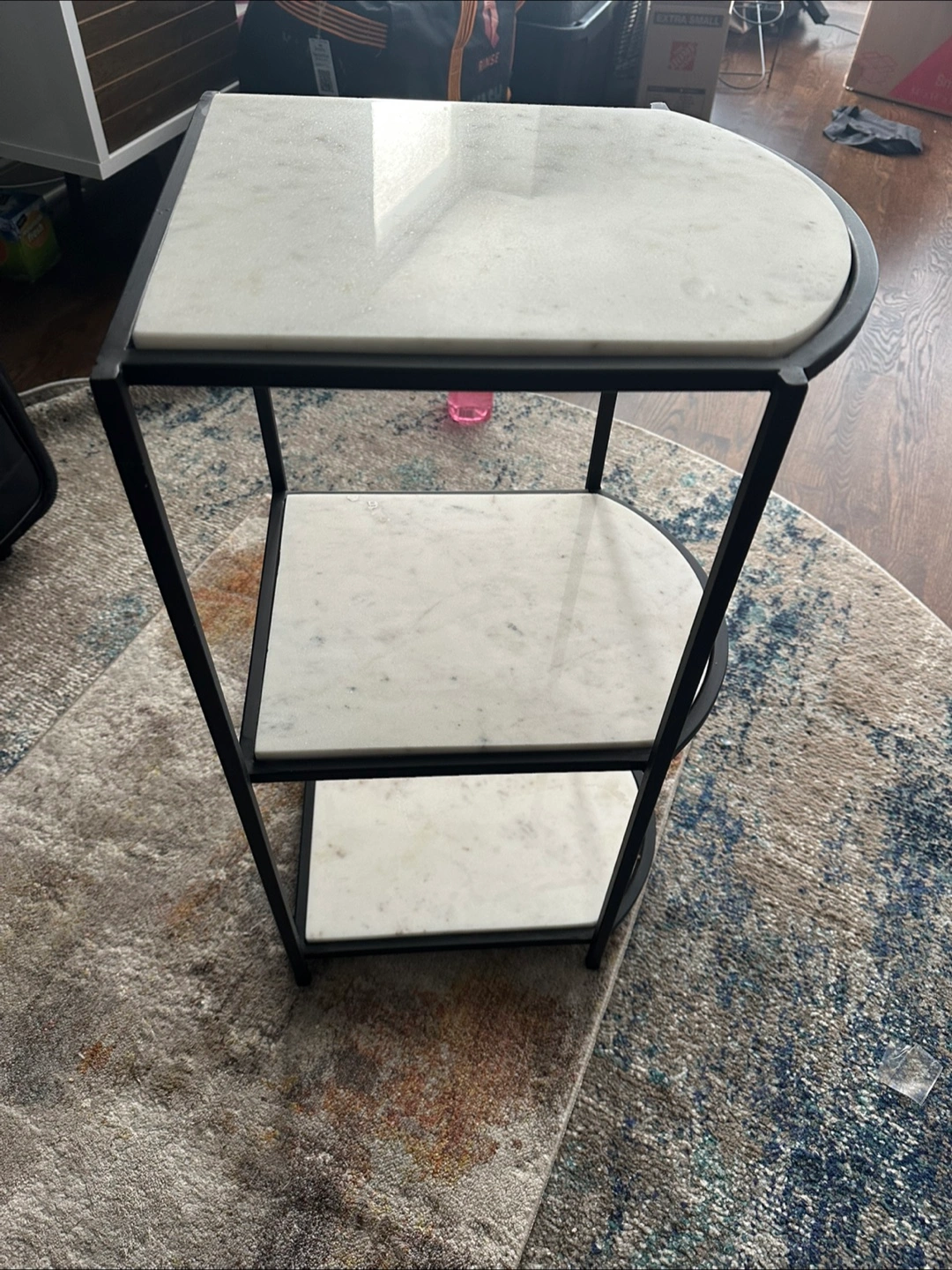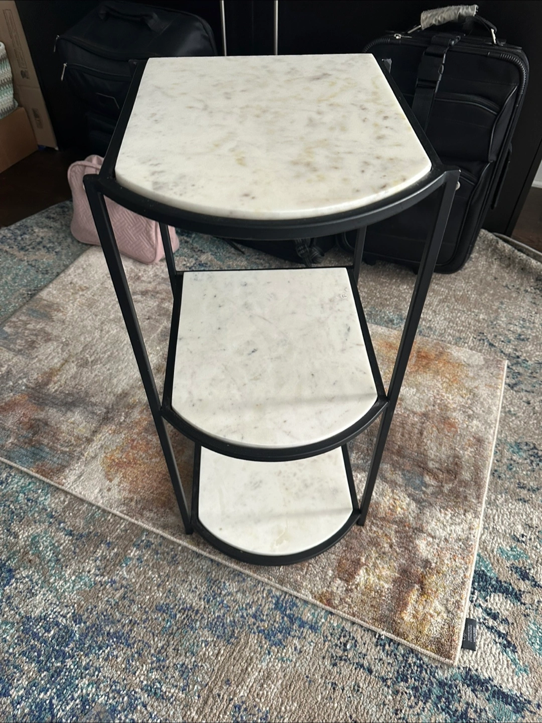 This is a marble top side table with a black metal frame. It features three tiers, providing ample space for storage or display. The table is in good condition and would be a stylish addition to any room