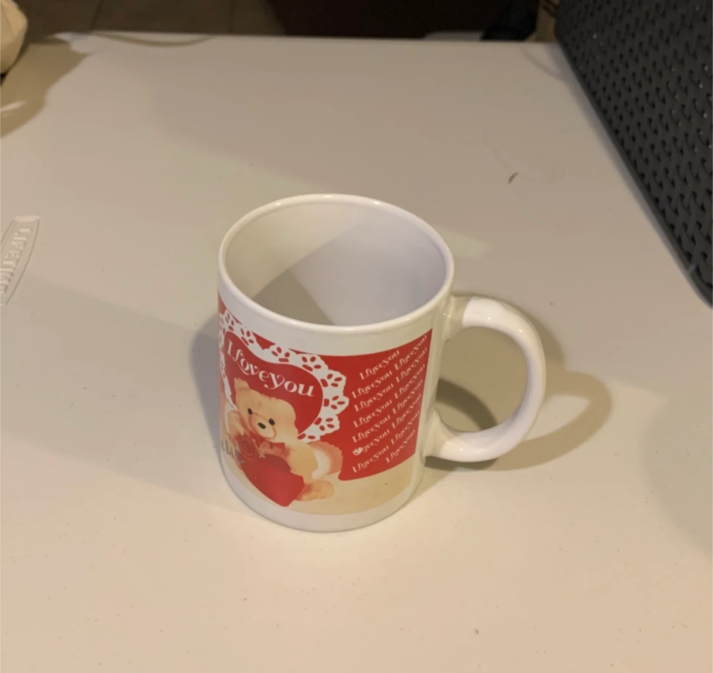 This white ceramic mug features a teddy bear graphic with "I Love You" text around it. It's perfect for enjoying your favorite hot beverages. Standard mug size.