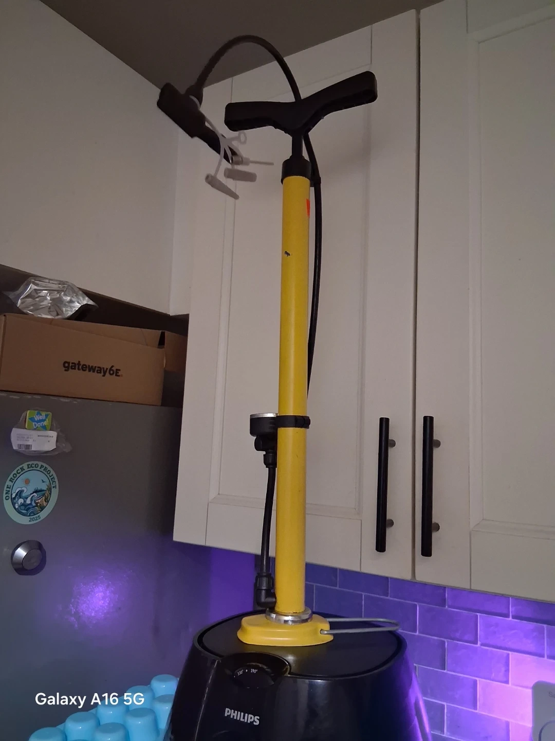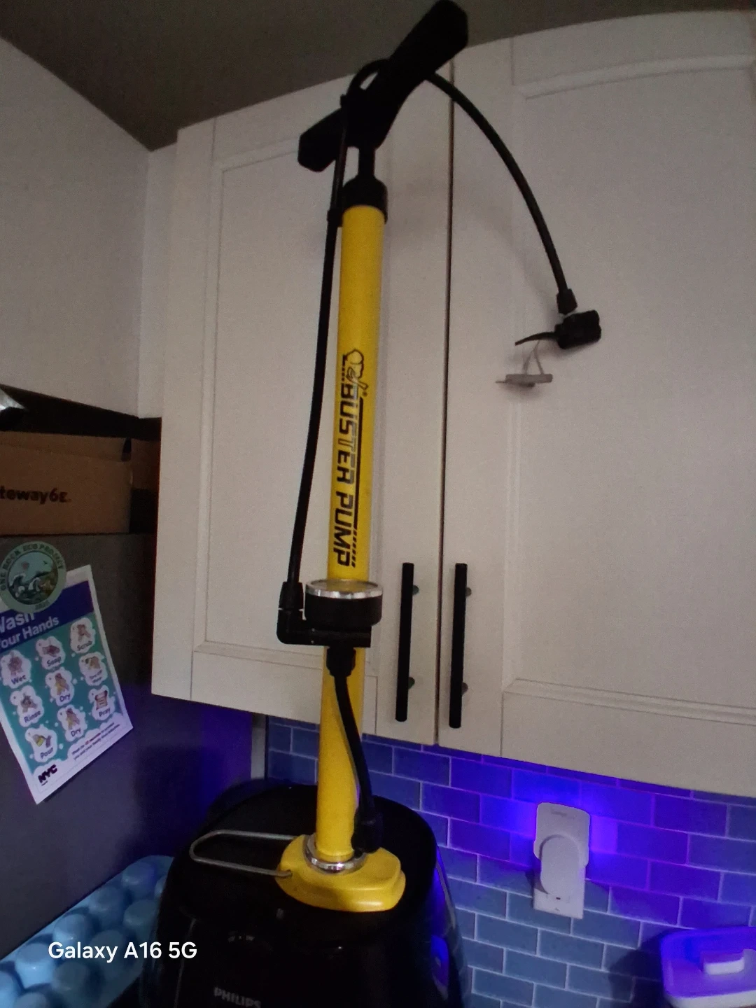 This is a yellow BUSTER PUMP floor pump. It has a flexible hose and multiple nozzle attachments. Use it to inflate tires on bikes or other items quickly!