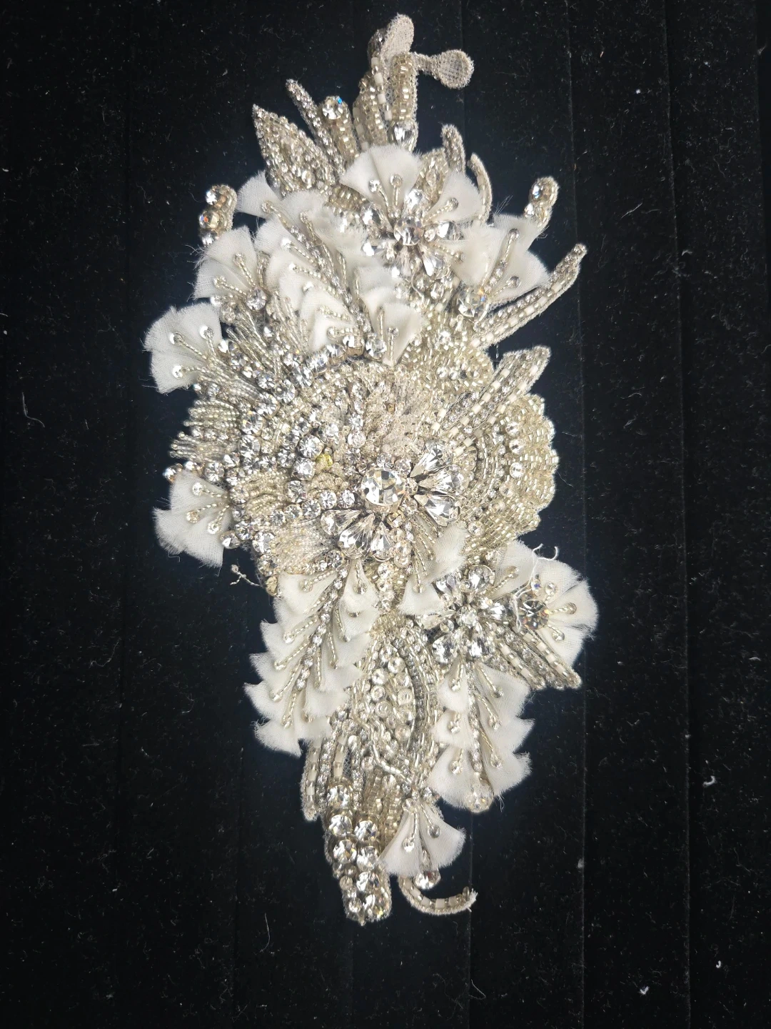 Beautifully crafted applique featuring intricate beadwork and sparkling rhinestones. Measures approximately 6 inches long. This piece is perfect for adding a touch of glamour to clothing or accessories. Great for DIY projects and custom designs!