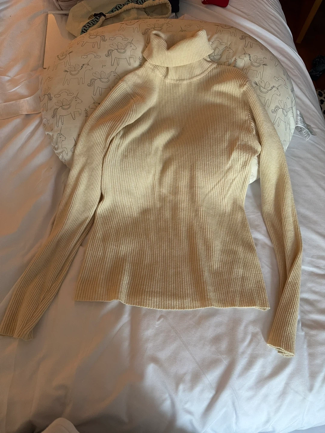 Cream ribbed turtleneck sweater with long sleeves. It's made of a soft, stretchy knit material. This sweater is a versatile layering piece for cooler weather.