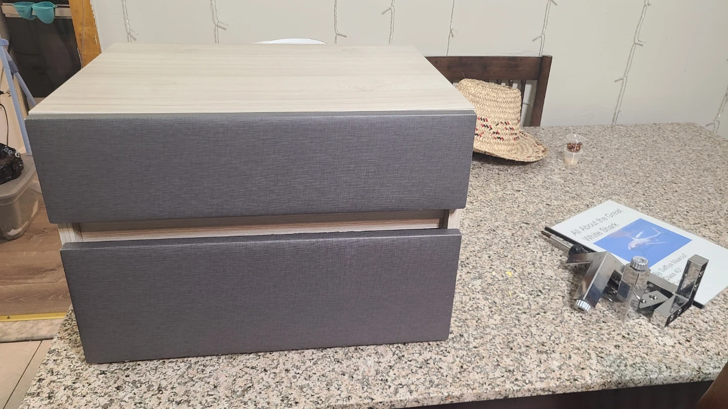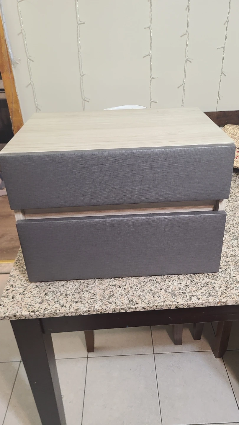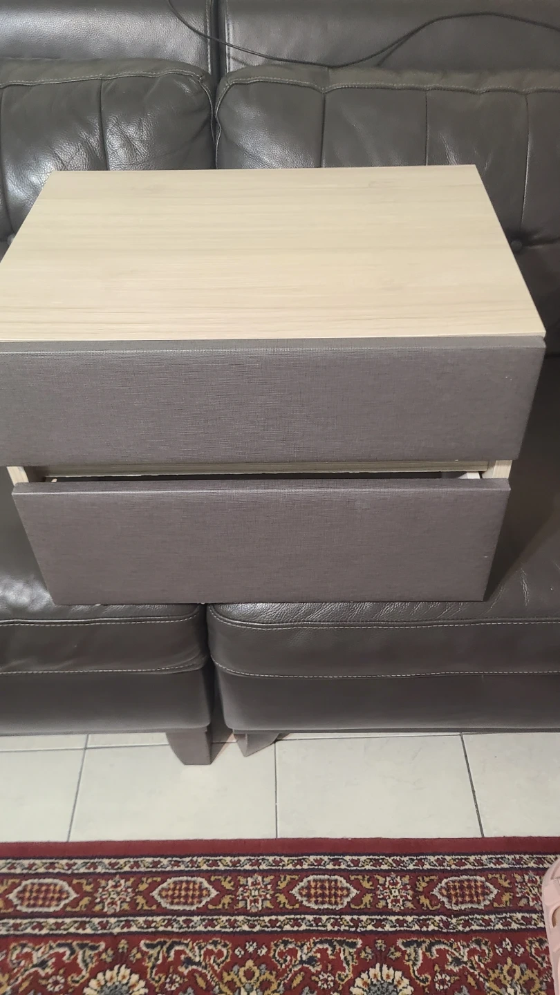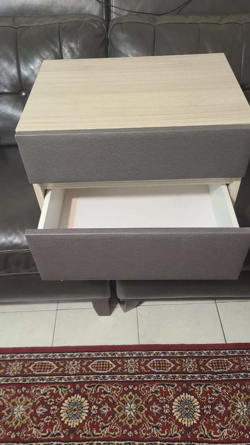 Selling a two-drawer nightstand. It's a great addition to any bedroom setup, providing convenient storage and a stylish look. The nightstand features a combination of gray and beige colors.and measure 19 inch long by 14.5 inch wide by 13 inch high