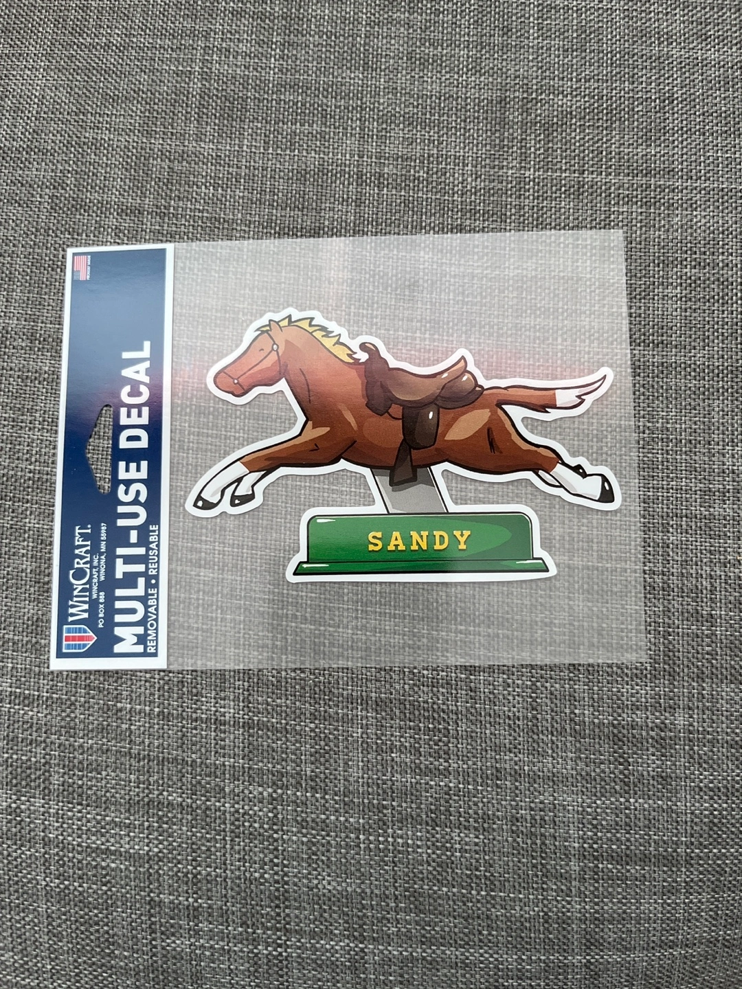 WinCraft multi-use decal featuring a horse named Sandy! It's removable and reusable, perfect for adding a personal touch to your belongings