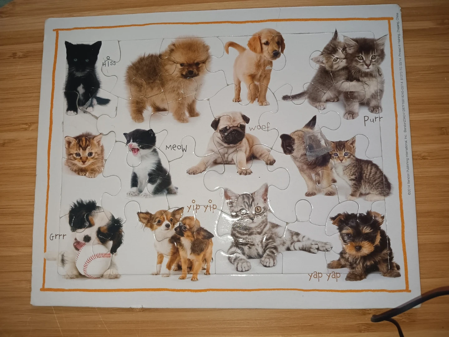 This 15-piece puzzle features a collection of cute puppies and kittens with playful sounds! It's a great puzzle for little ones learning to identify animals. The pieces are made of sturdy cardboard.