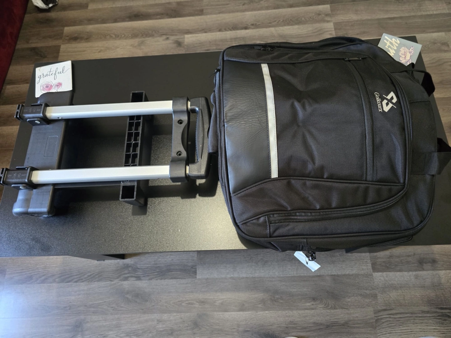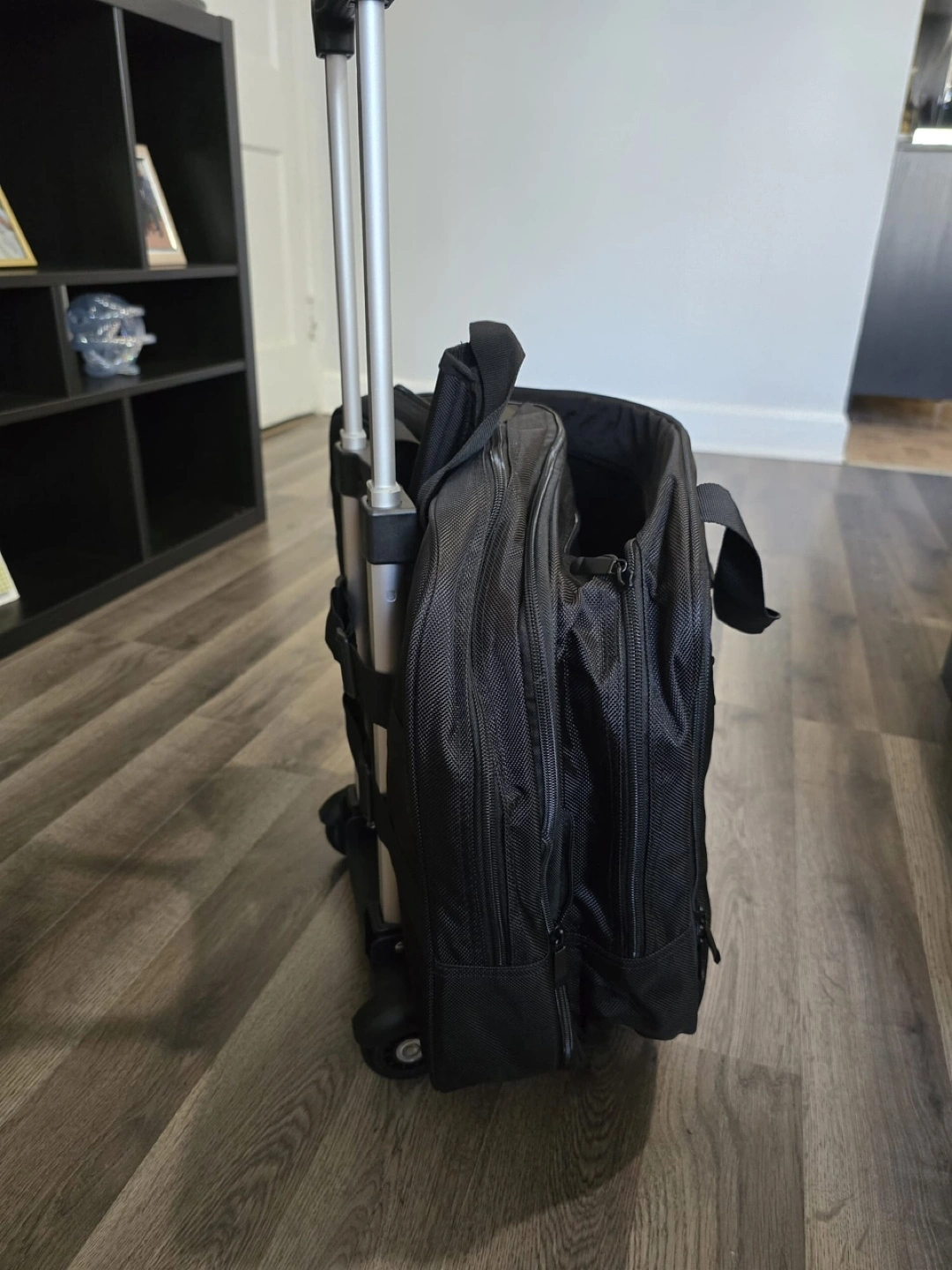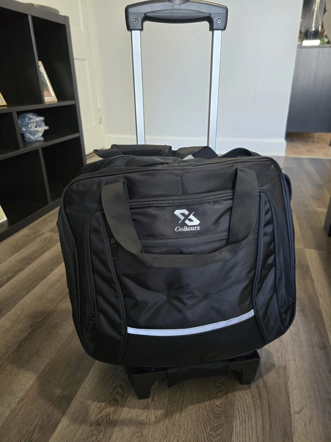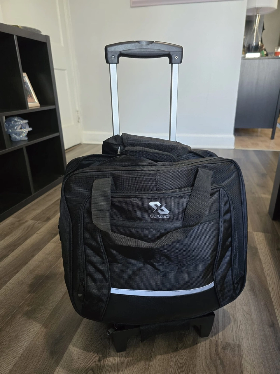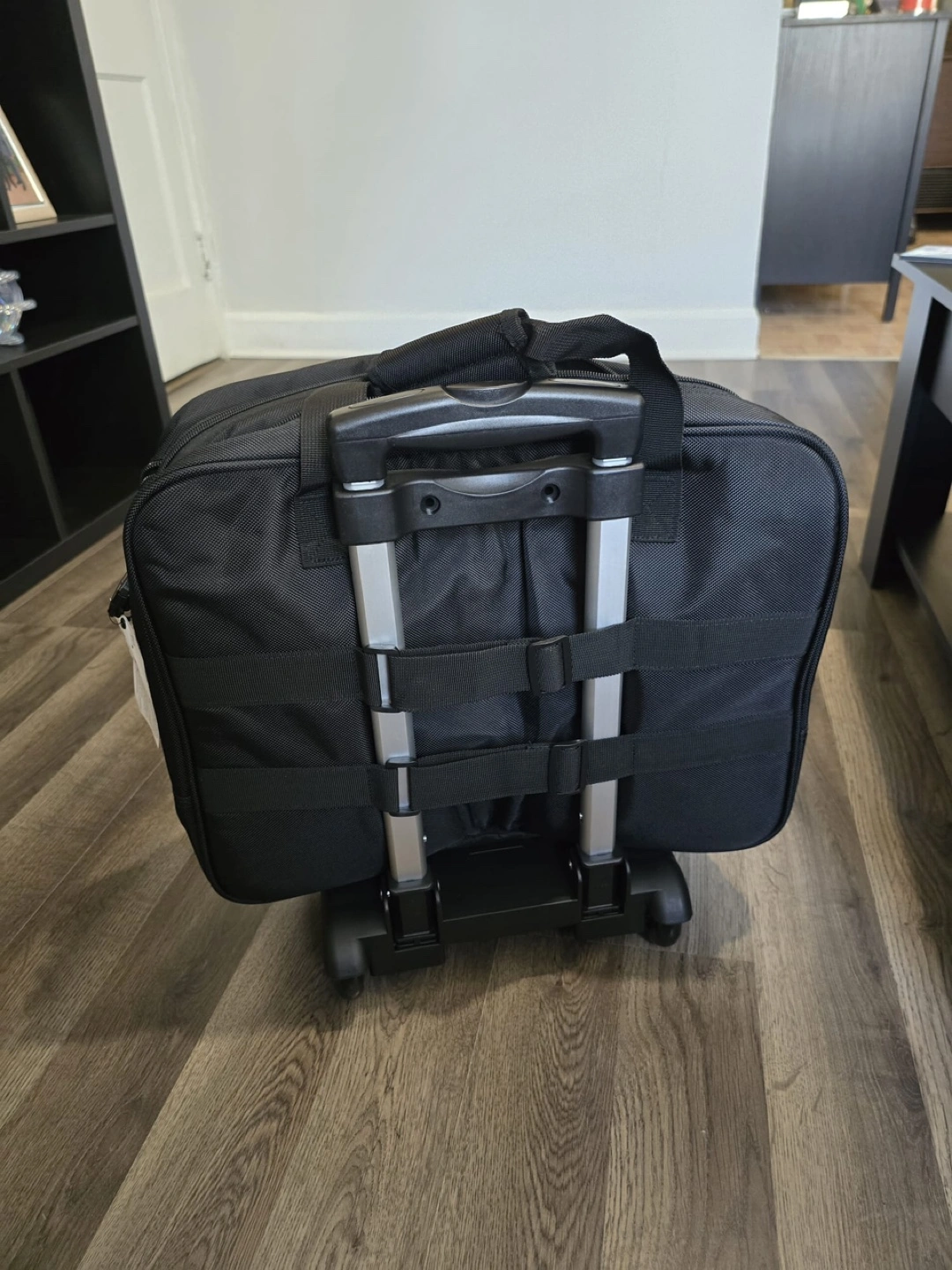 New Black rolling duffel bag. Features a telescopic handle and inline skate wheels. Multiple compartments and pockets. Ideal for weekend trips or business travel.