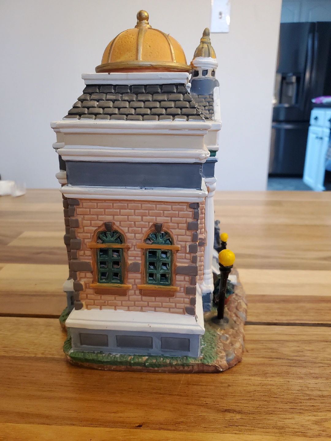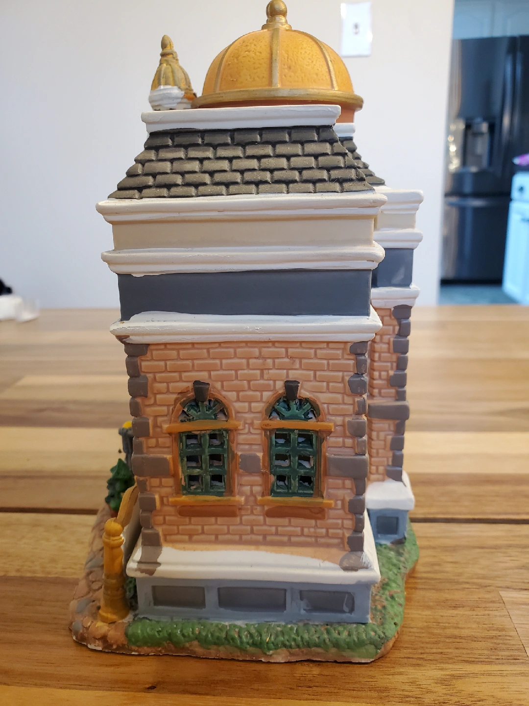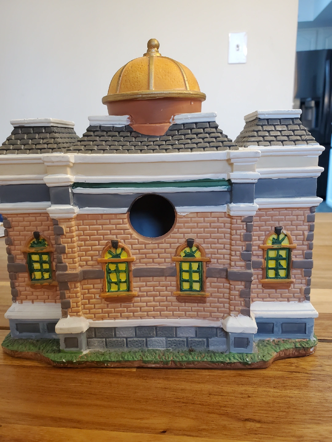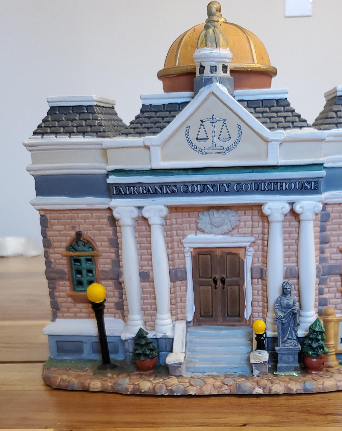 This is a decorative figurine of the Fairbanks County Courthouse. It has a gold dome, brick facade, and miniature statues. It is in great condition and would be a nice addition to any collection