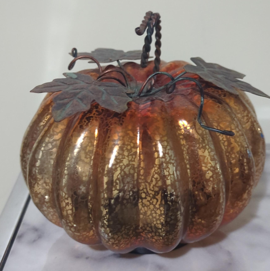 I'm selling a lovely pumpkin decoration, perfect for adding a touch of autumn to your home! It features a beautiful metallic finish and decorative leaves and stem. It's in great condition and ready to bring some seasonal cheer to your space