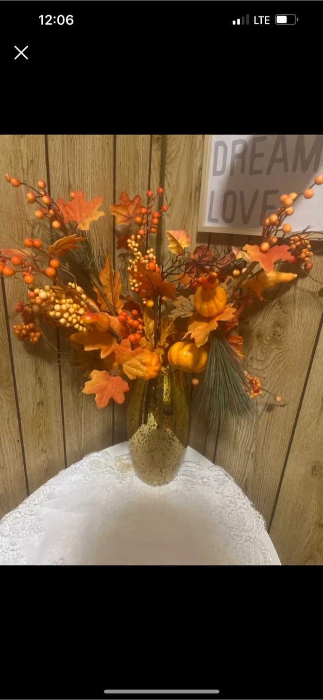 Beautiful fall-themed floral arrangement in a decorative vase. Perfect for adding a touch of autumn to your home decor
