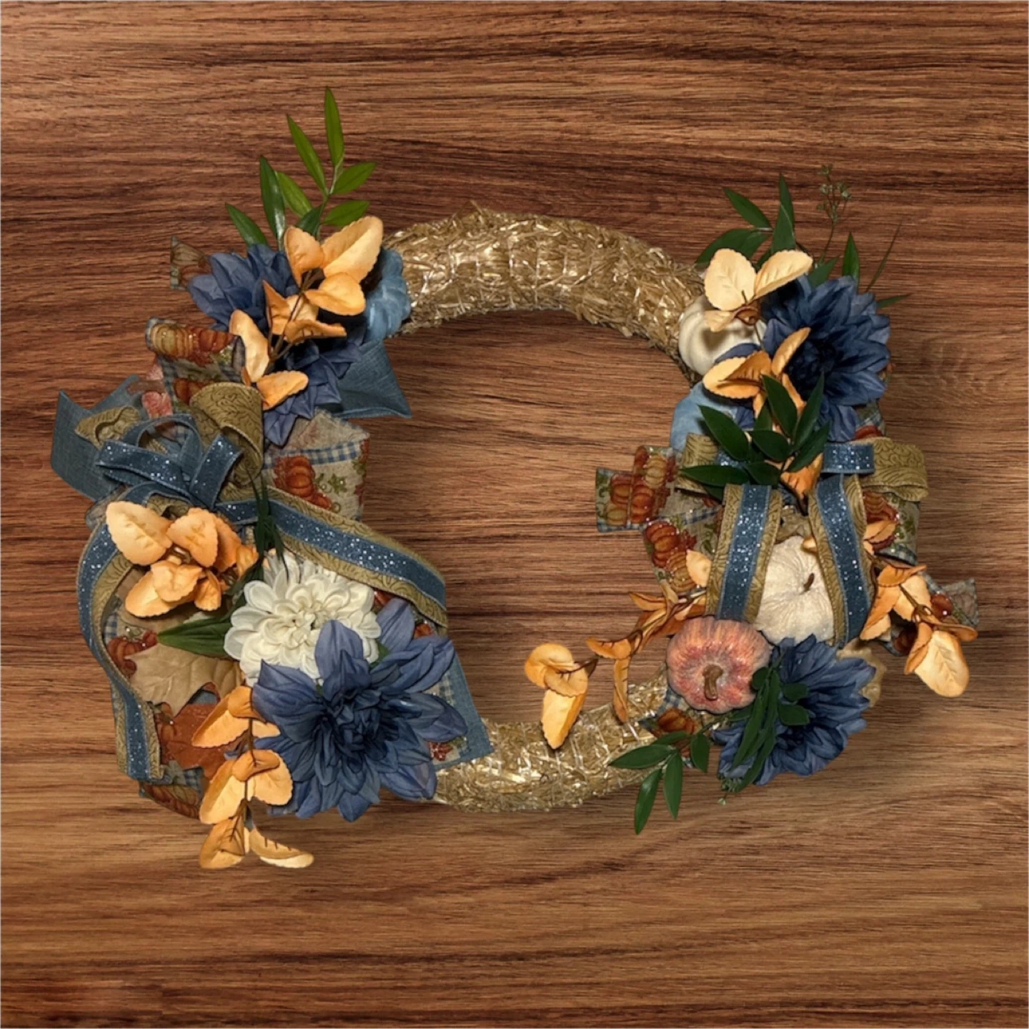 15Beautiful fall harvest wreath with pumpkins, leaves, and flowers! Perfect for adding a touch of autumn to your home decor