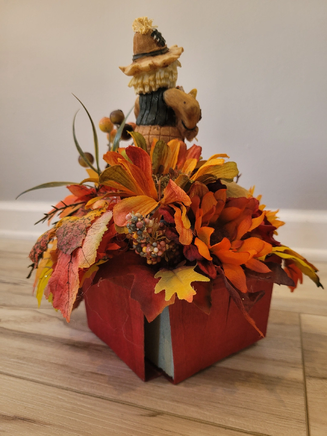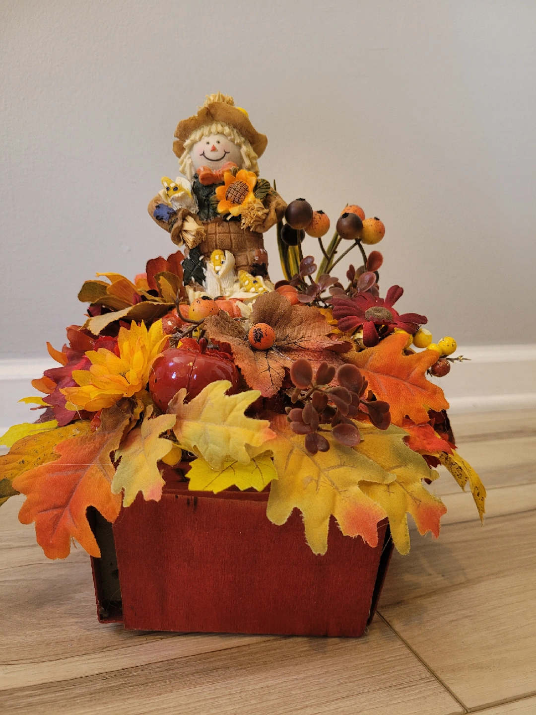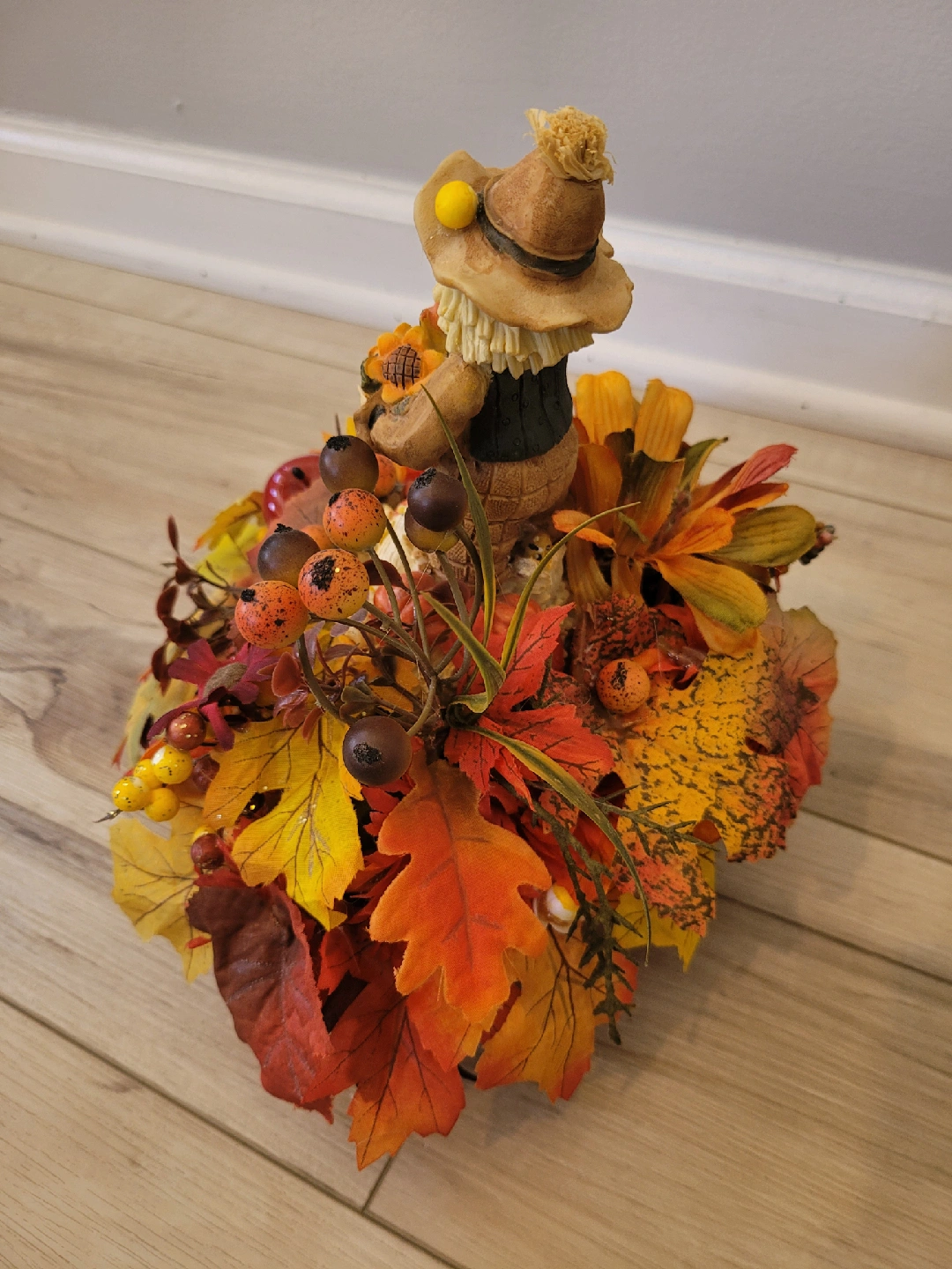 85This is a fall scarecrow crafted decoration that would be perfect for your home. It features a scarecrow with a hat and a bouquet of flowers. The base is decorated with leaves and berries, creating a warm and inviting fall scene. Perfect center piece and fabulous for Thanksgiving. Approximately 10 inches high and just under 5 inches at smallest part of base. Feel free to check out my other unique items listed.