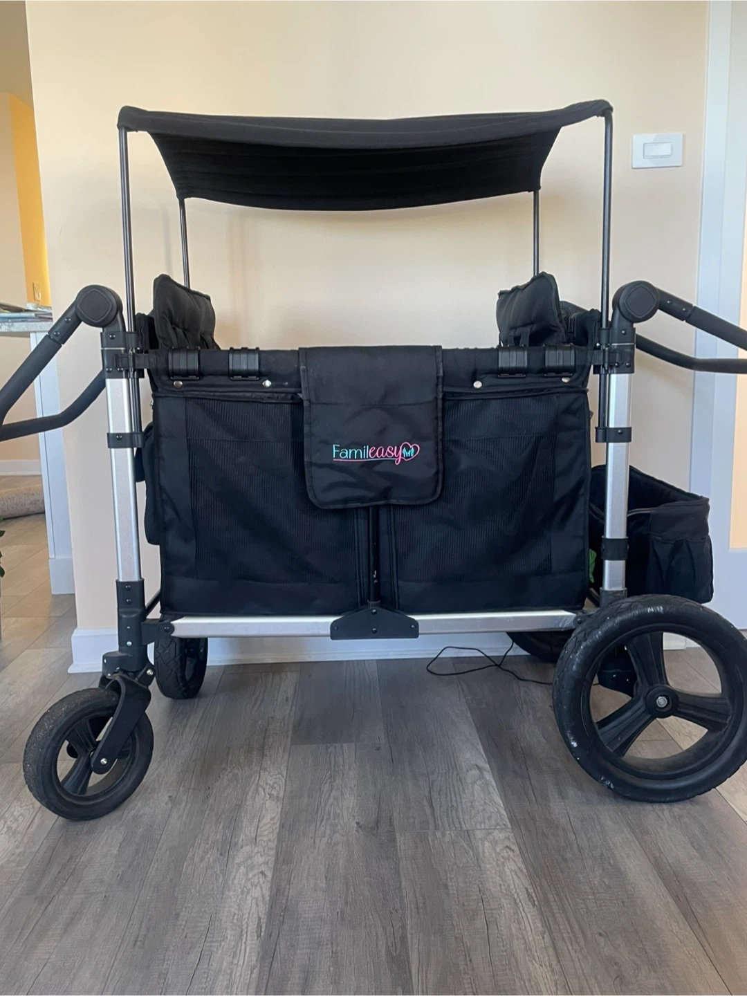 10Selling a Famileasy double stroller wagon in black. It's in good condition and ready for new adventures! Perfect for families with two or up to four little ones. It features a canopy to keep the sun out and plenty of storage for all your essentials. We also have the plastic to keep your kids dry on rainy days.