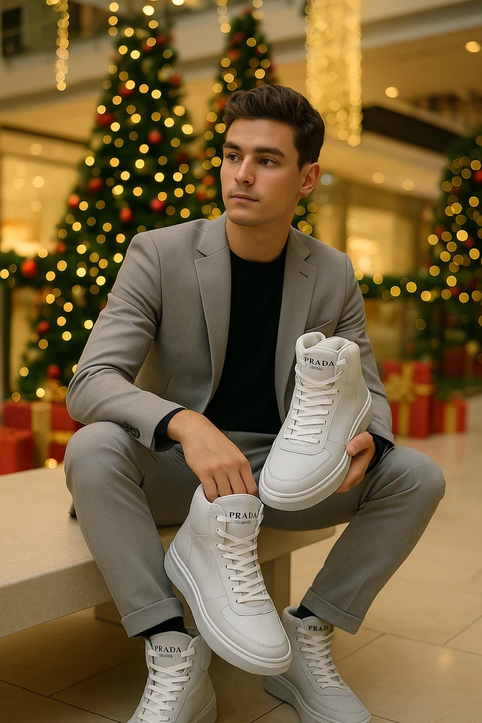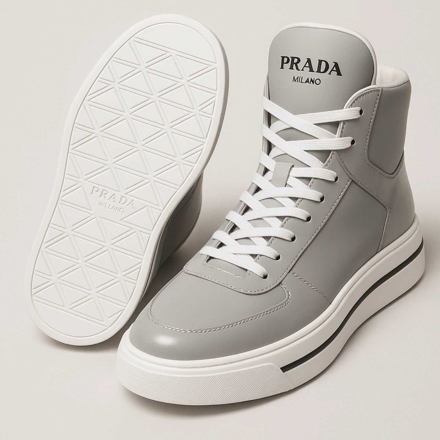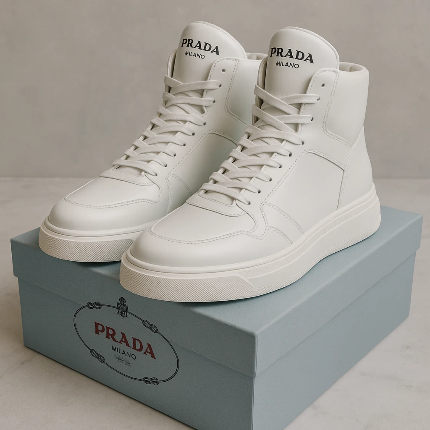 High-top design, soft cushioning, and signature Prada branding.