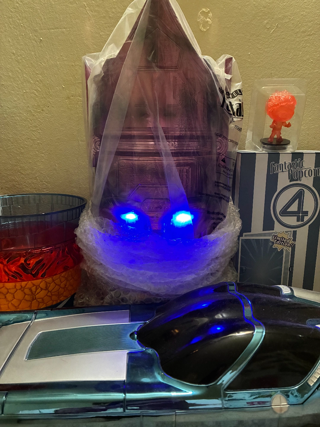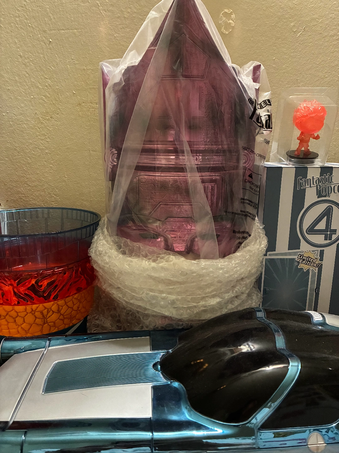fantastic four first steps set of 4. galactus head, fantastic car, and two different popcorn buckets with a mystery topper (human torch) inside. price is firm.