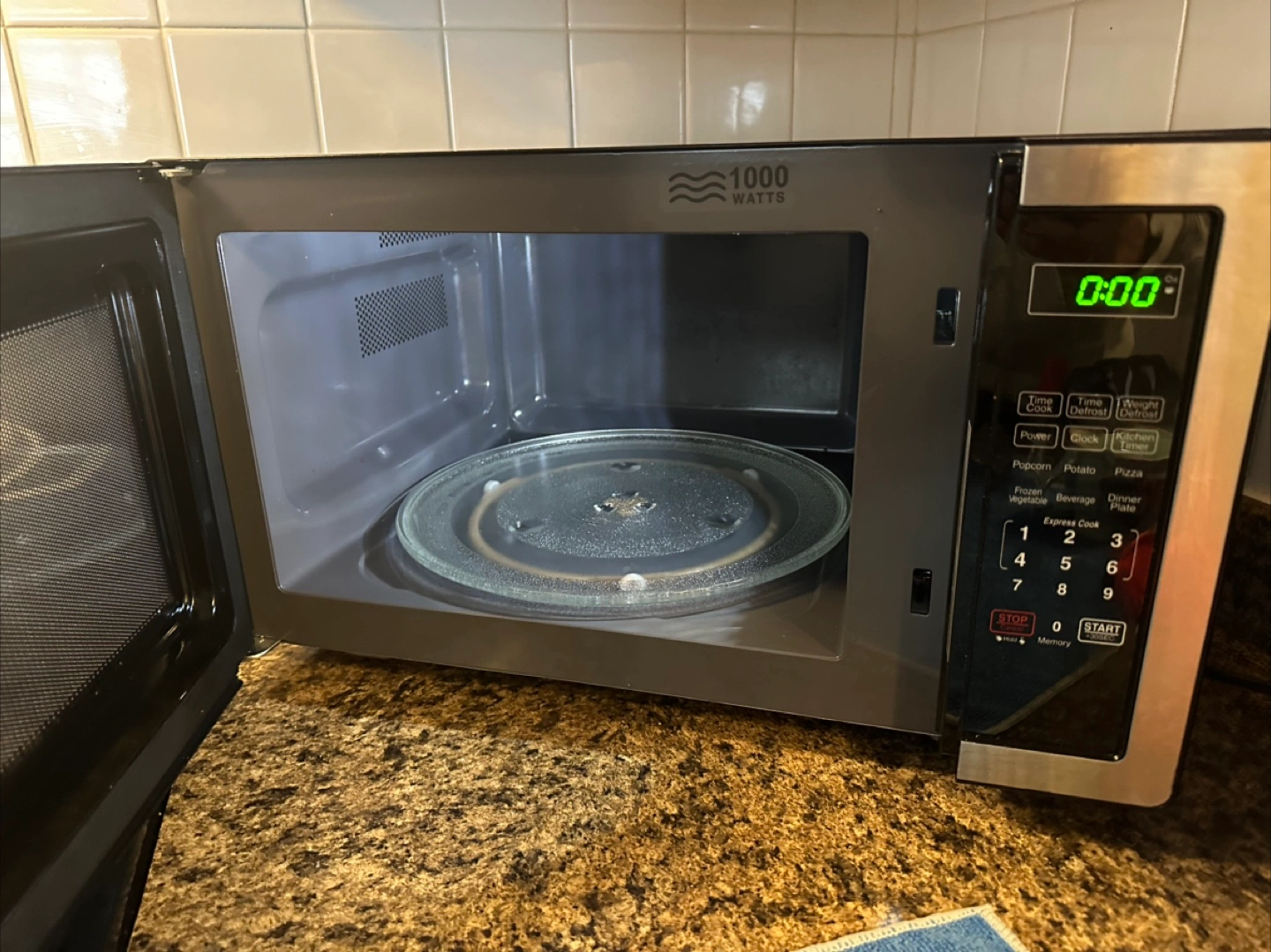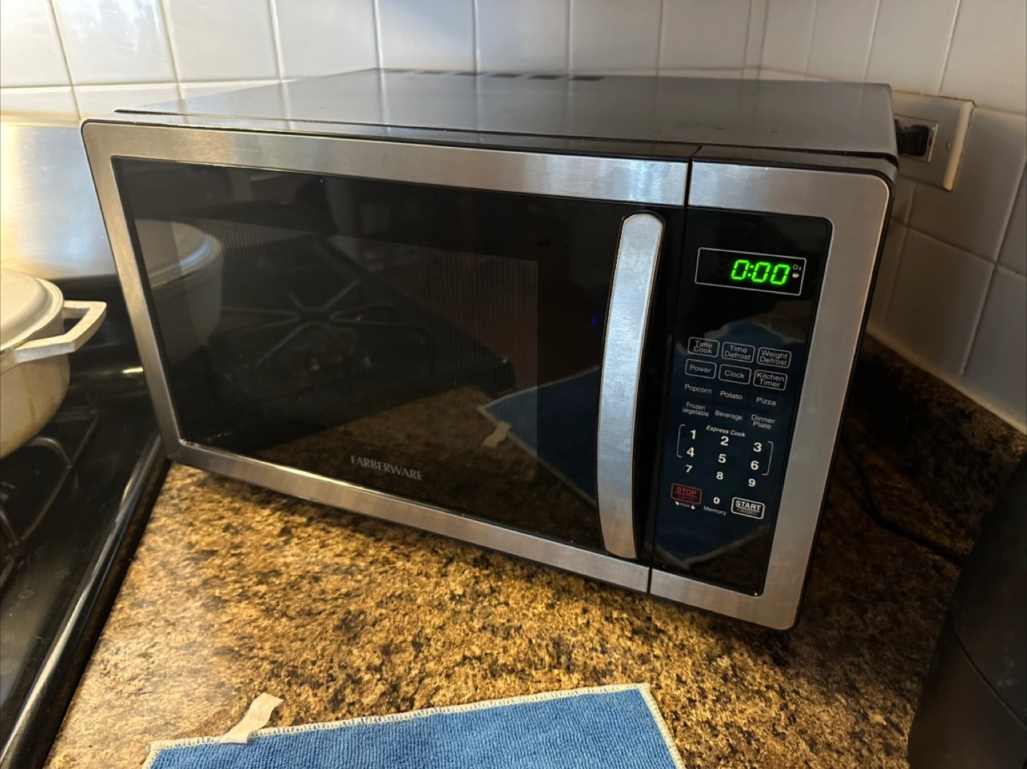 Farberware countertop microwave oven 1000 Watts, 1.1 cu ft LED Lighting and Child Lock Stainless Steel Bought in 2023. Valued at $120 in Amazon 16.54"'D x 20.2"W x 12.03"'H
