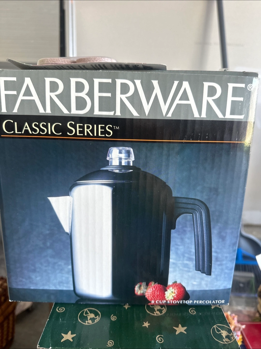 Selling a brand new Farberware Classic Series 8-Cup Stovetop Percolator! It's still in its original box and ready to brew some delicious coffee. Perfect for anyone who loves that classic percolator taste