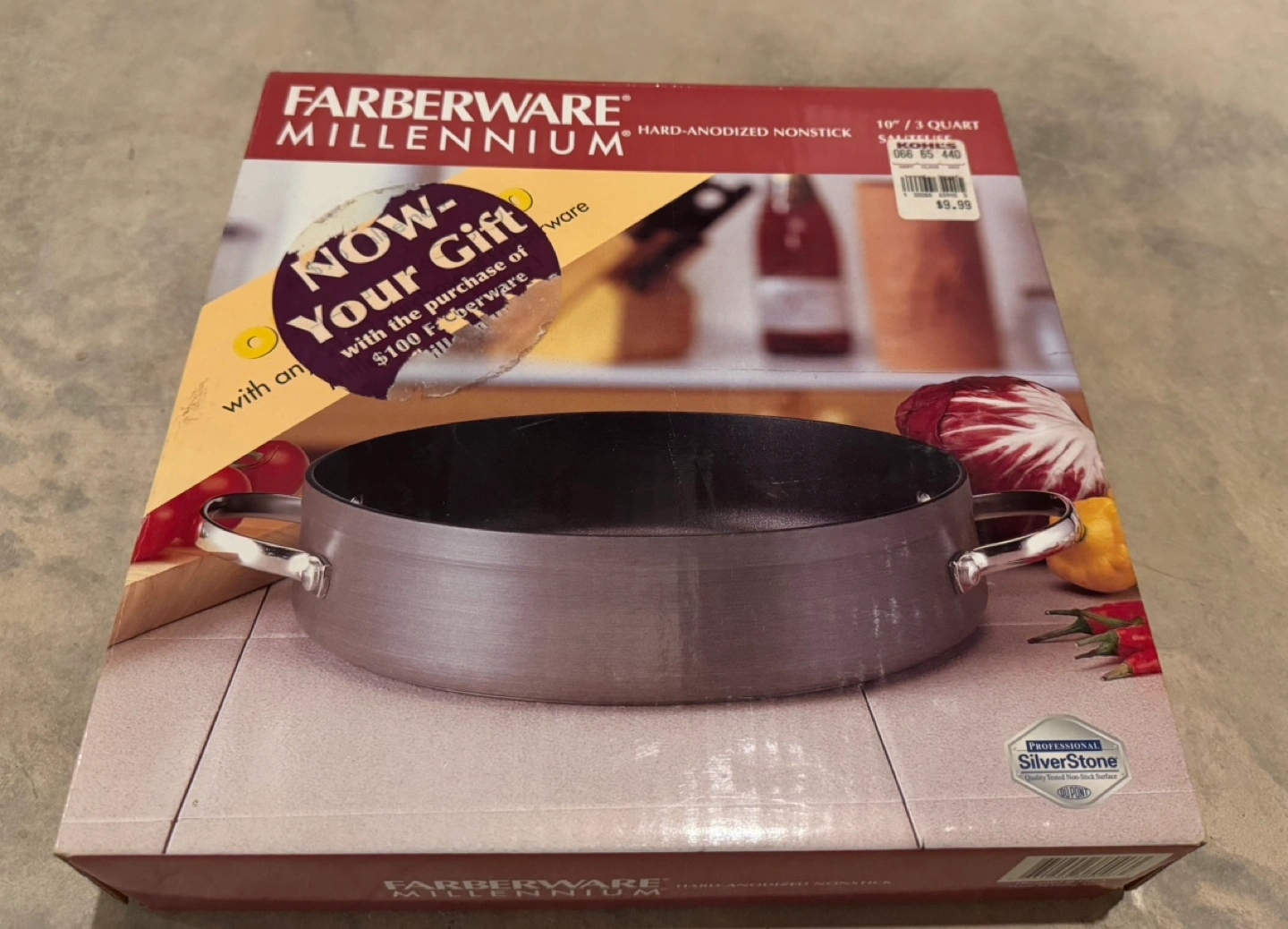 52New in box. Hard-anodized nonstick saute pan. SilverStone professional coating. 10 inch diameter, 3 quart capacity. Two side handles.