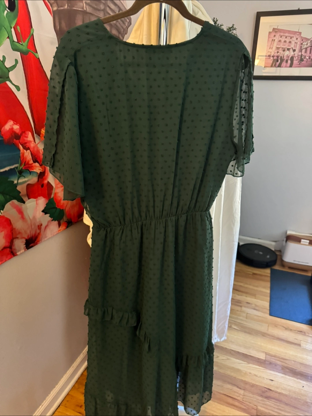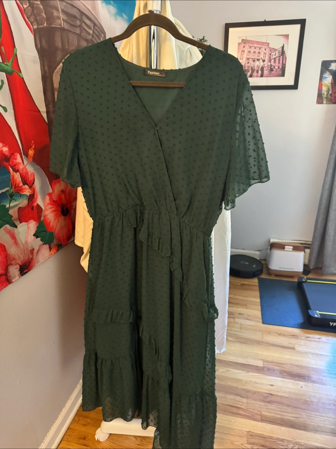 Selling a cute green dress in size L! It features a flattering silhouette and a comfortable fit. Perfect for any occasion