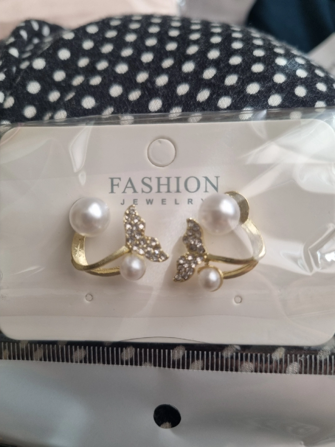 These are a pair of new Fashion Jewelry earrings! They feature a gold-tone design with pearl accents and a sparkling leaf-like detail. Perfect for adding a touch of elegance to any outfit