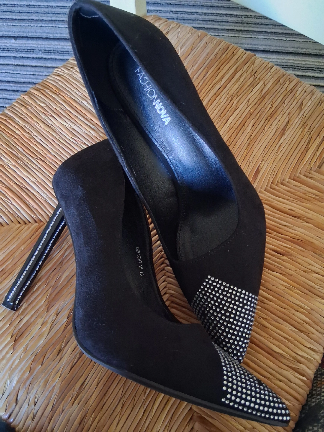 Selling a pair of black heels from Fashion Nova. They are a size 10 and have a stylish design with rhinestones on the toe and heel. Perfect for a night out!