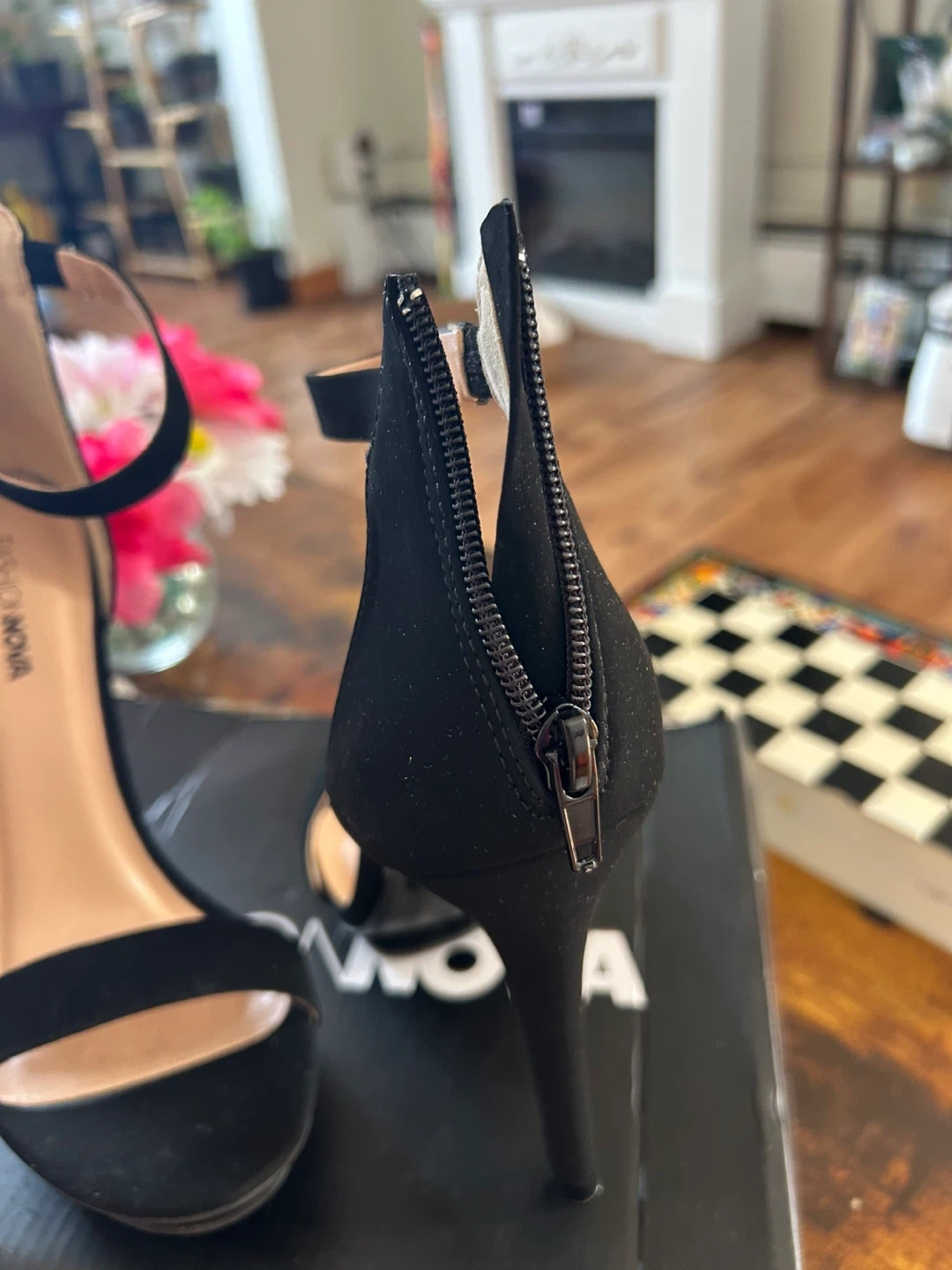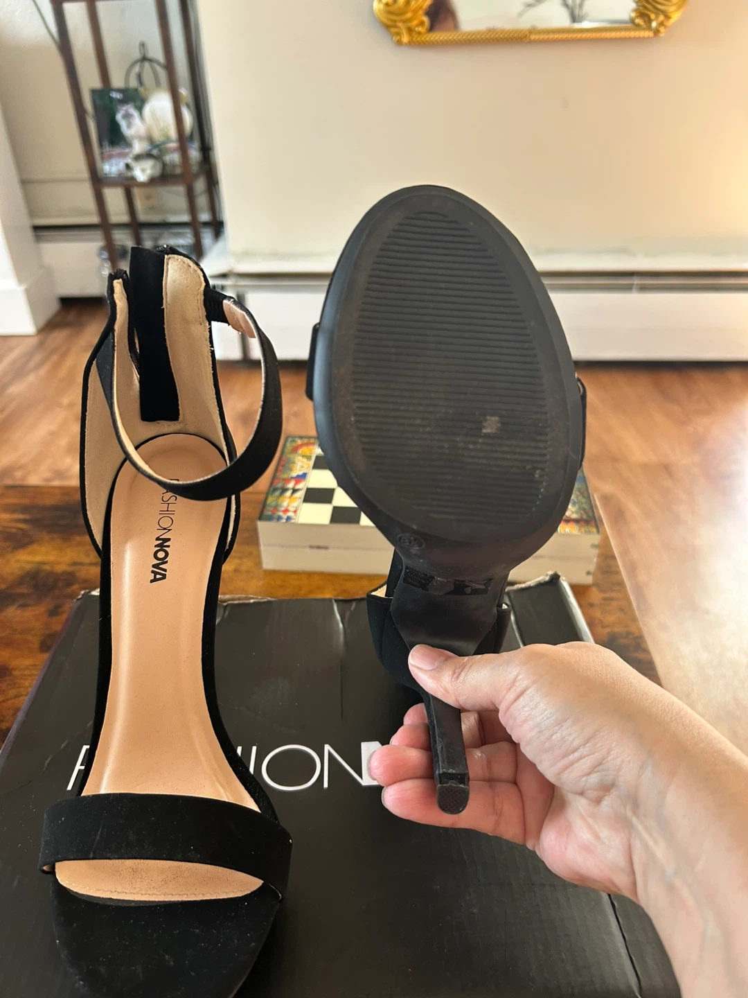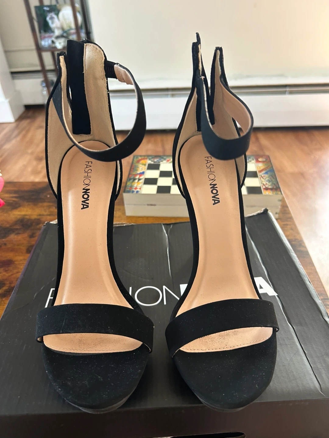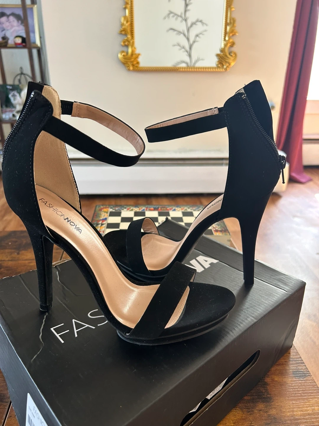65Selling a pair of Fashion Nova black heels in size 8.5! They are made of nubuck PU material and feature a zipper closure in the back. Perfect for a night out!
