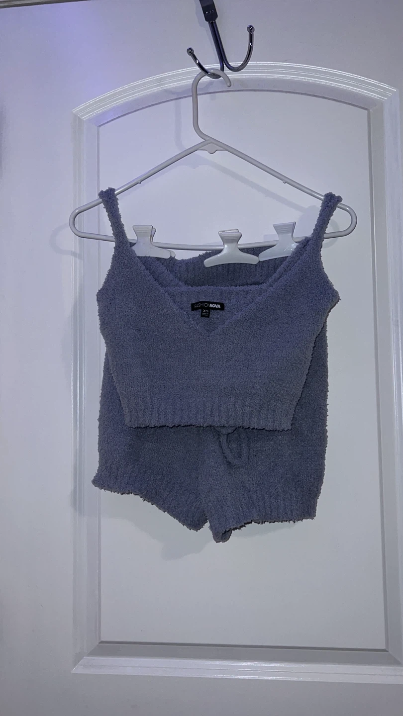 65Selling a super cute and comfy Fashion Nova fuzzy crop top and shorts set in size XS! The set is a lovely shade of blue and is perfect for lounging around the house or a casual day out. The material is soft and cozy, making it a great addition to your wardrobe